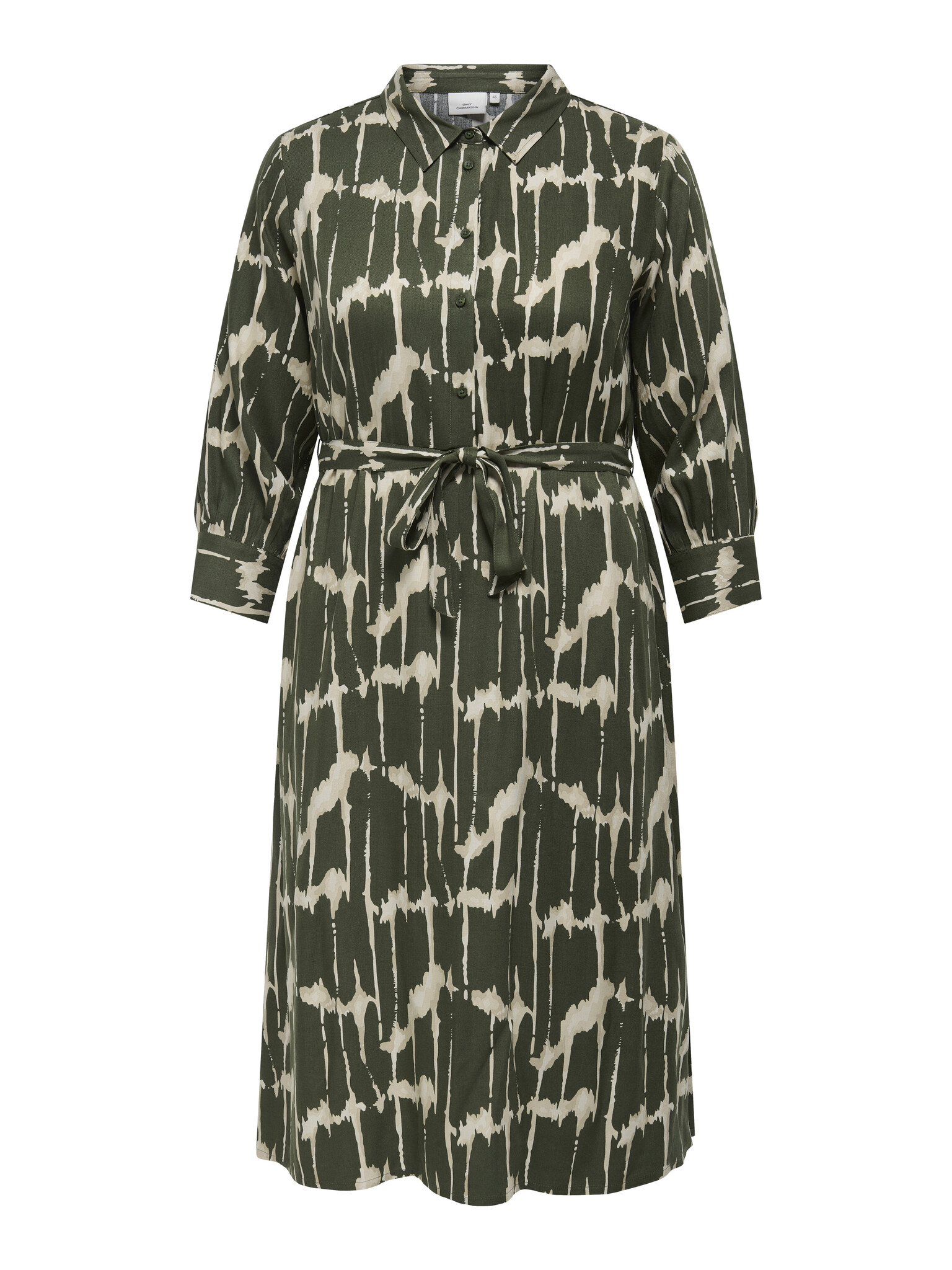Deze prachtige jurk van ONLY Carmakoma straalt vrolijkheid uit door de groene met beige print. Het ceintuur in de taille zorgt voor een mooi, vrouwelijk silhouet, terwijl de splitjes aan de onderzijde de jurk een speelse en elegante uitstraling geven. Een heerlijk draagbaar model dat perfect is voor zowel alledaagse looks als speciale momenten.