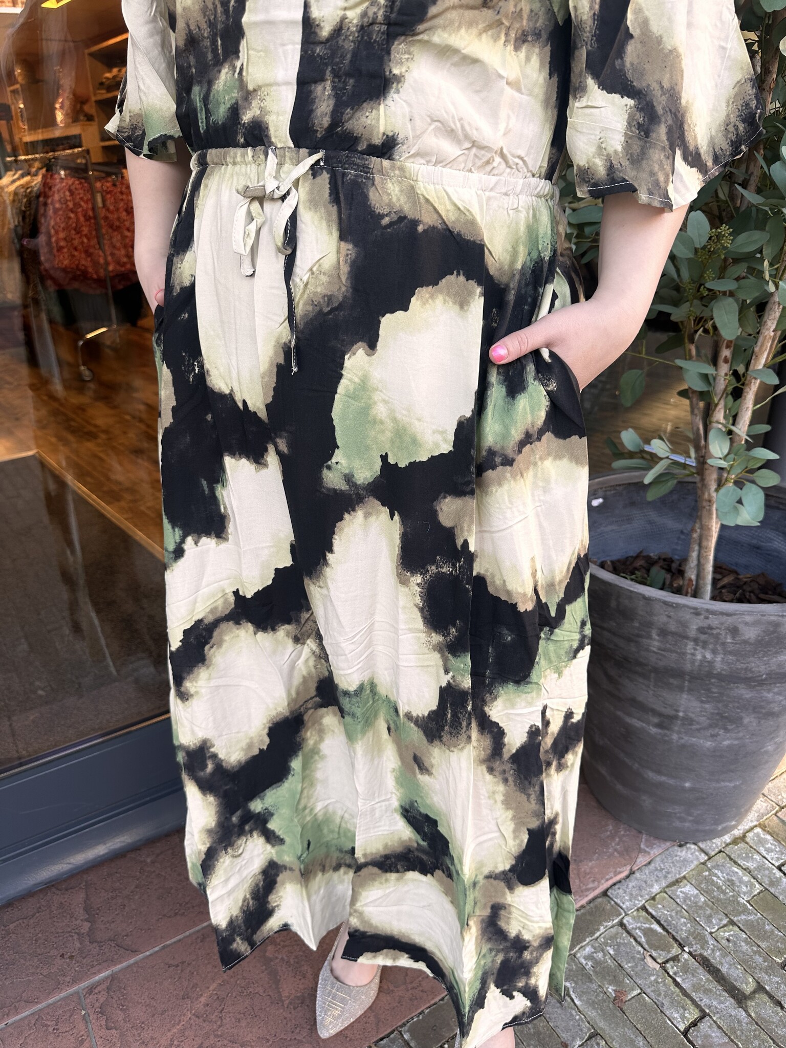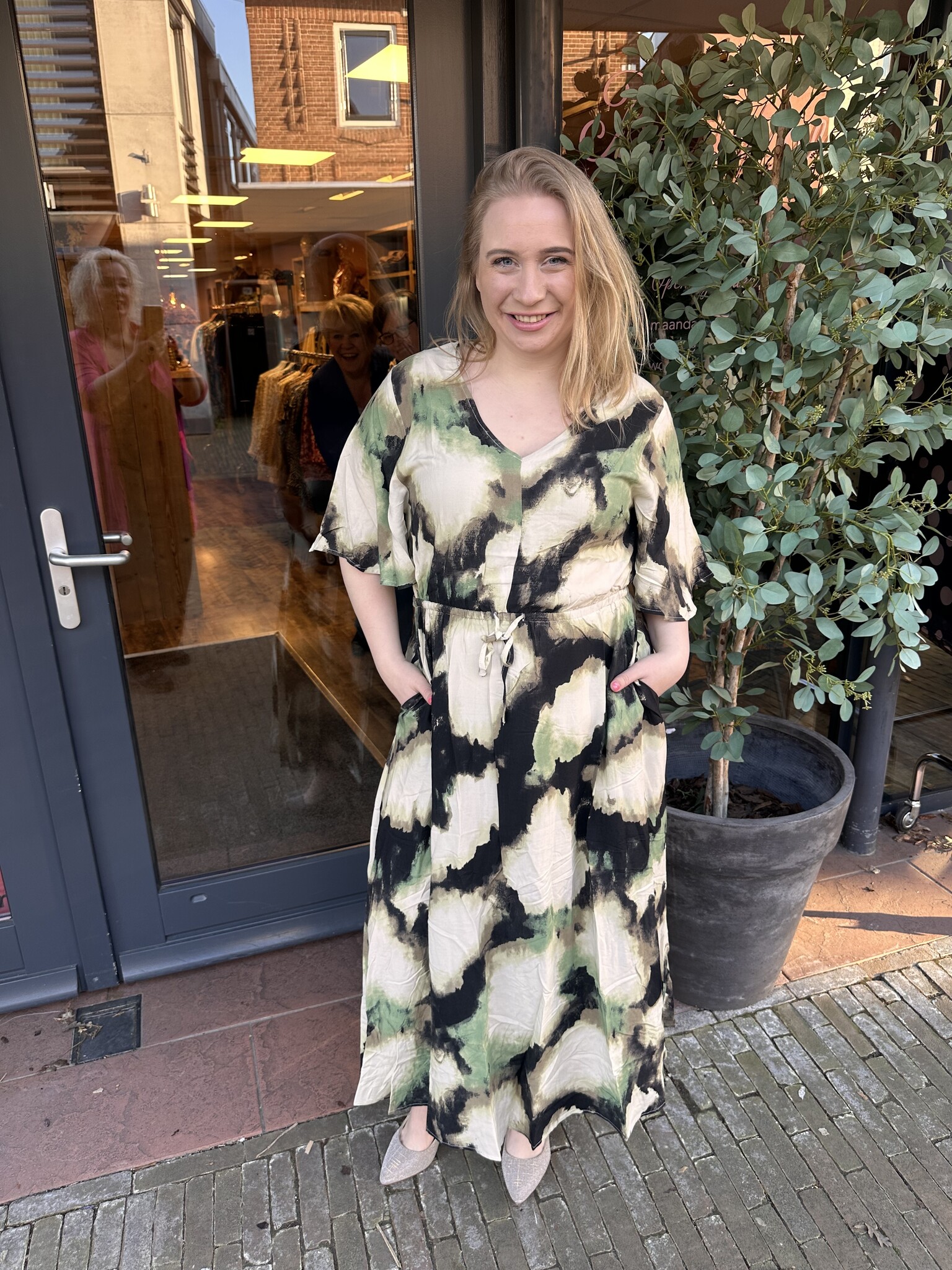 Deze jurk van Only Carmakoma is een fijn item voor een elegante outfit. De jurk heeft een mooie aquaral print in creme, groen en zwarte kleur en heeft een losvallend model. De luchtige stof zorgt voor een prettig draagcomfort. Uitgevoerd als elegante maxjurk met centuur in de taille en v-hals.