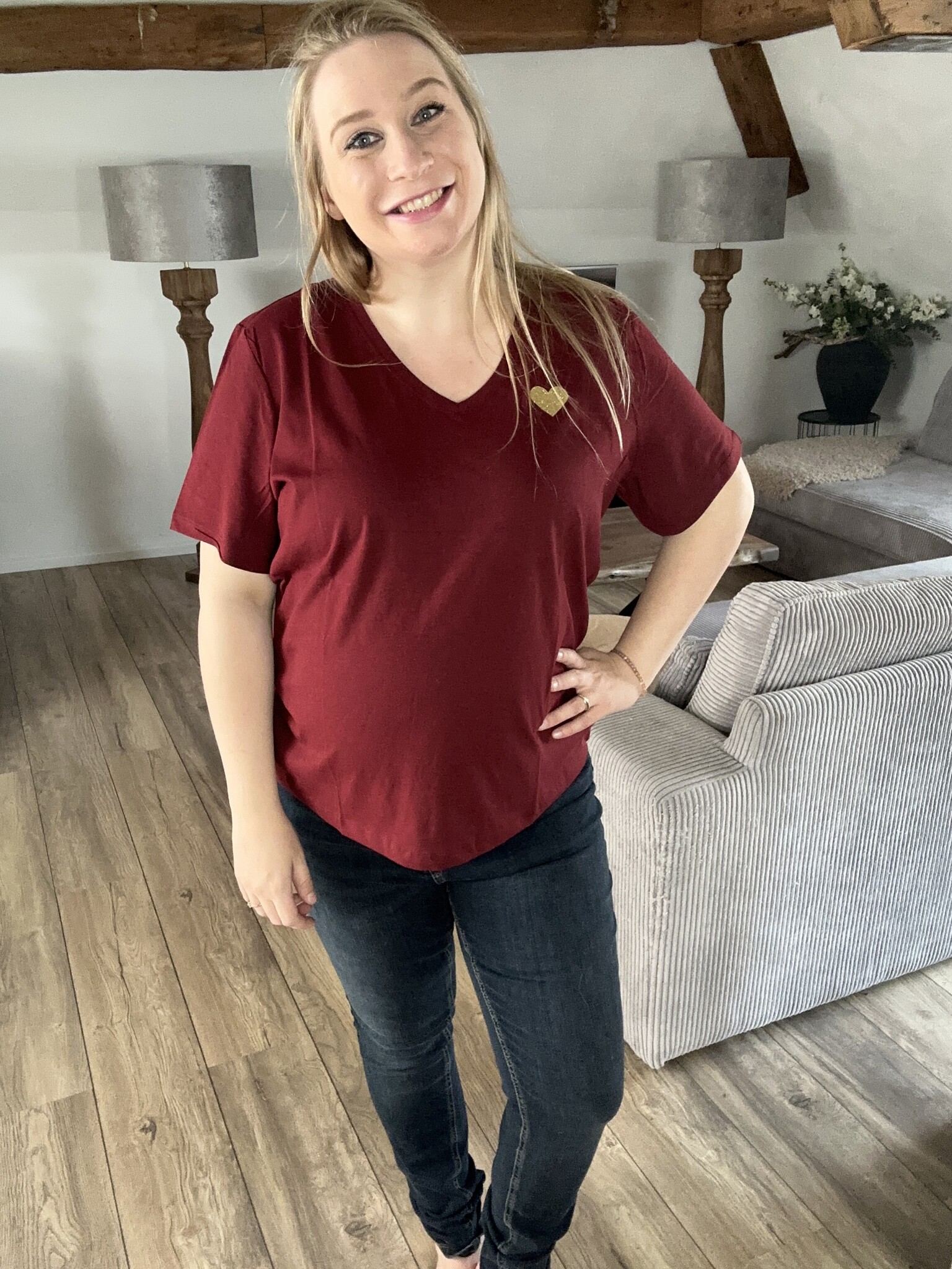 Only Carmakoma - Super leuk rood t-shirt met v-hals en gouden hart op de borst als detail. Valt op maat.