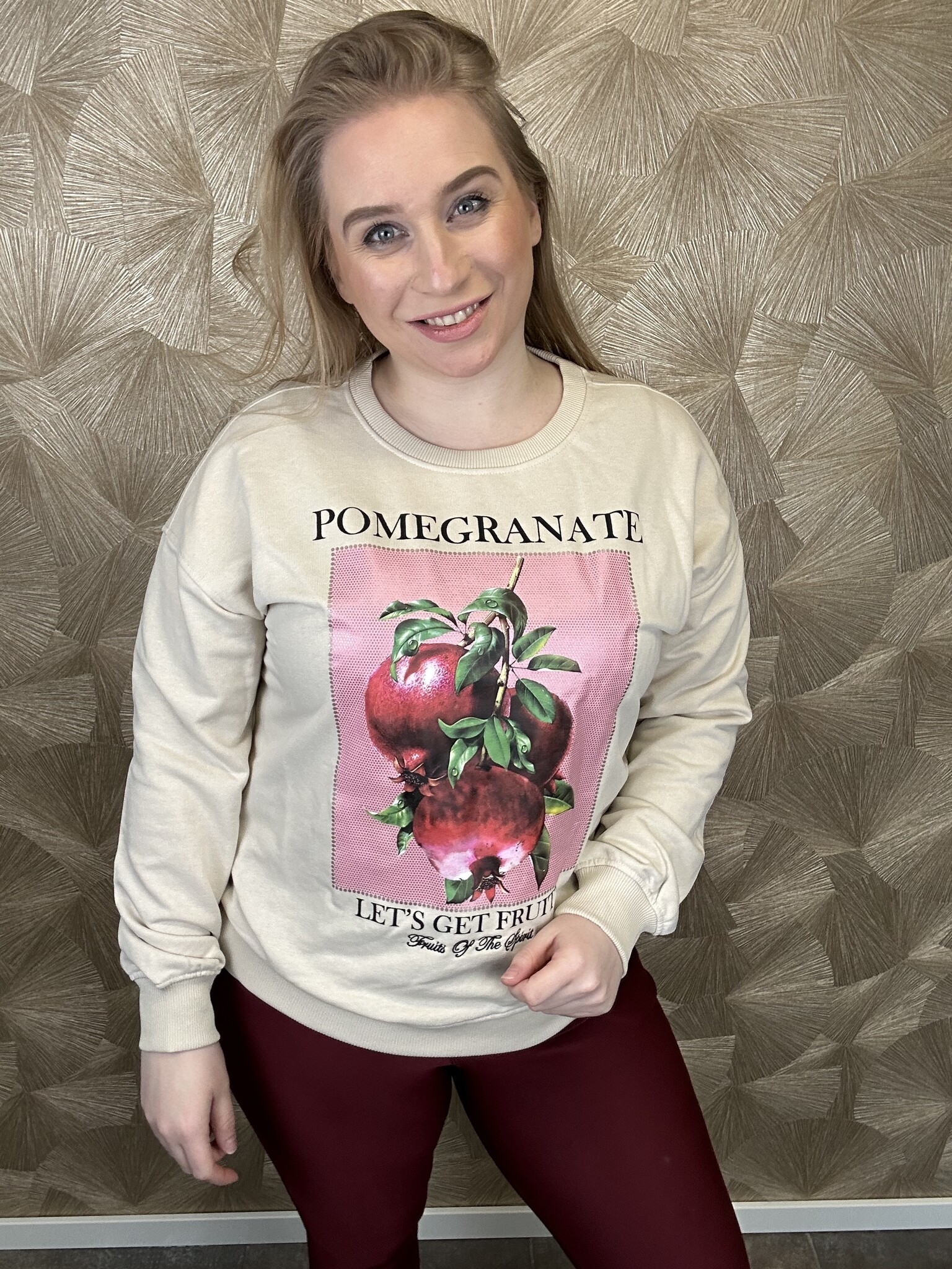 Only Carmakoma - Wat een prachtige trui van het merk Only carmakoma. De trui valt goed op maat & is uitgevoerd met een beige ondergrond en een leuke opdruk met granaatappels.