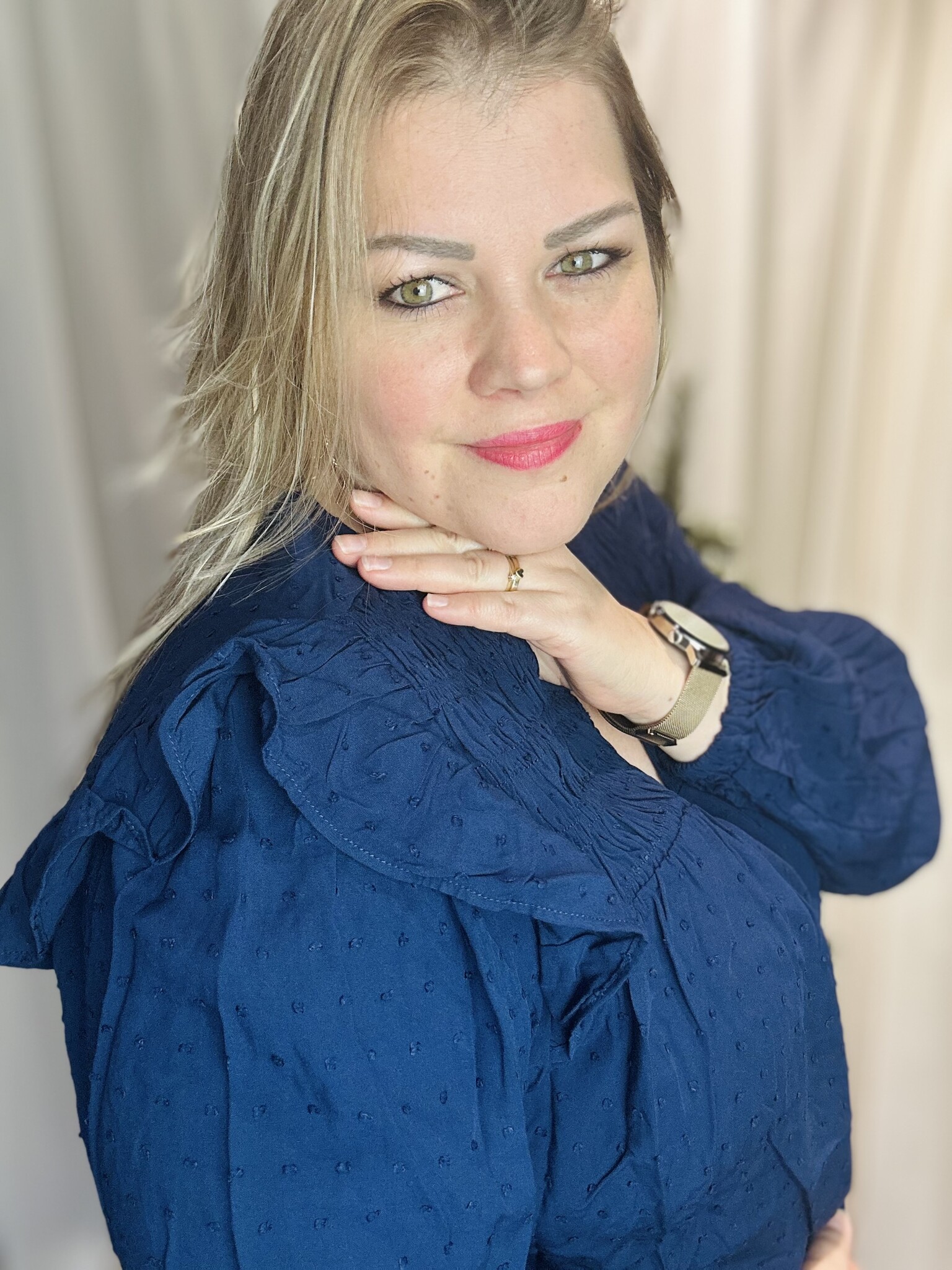 Een echte musthave! Dit mooie blousje is uitgevoerd in een fraaie blauwe kleur en heeft een prachtige smockbewerking aan de bovenkant. Op de schouders zitten leuke roezels, wat het geheel een speelse en stijlvolle uitstraling geeft.