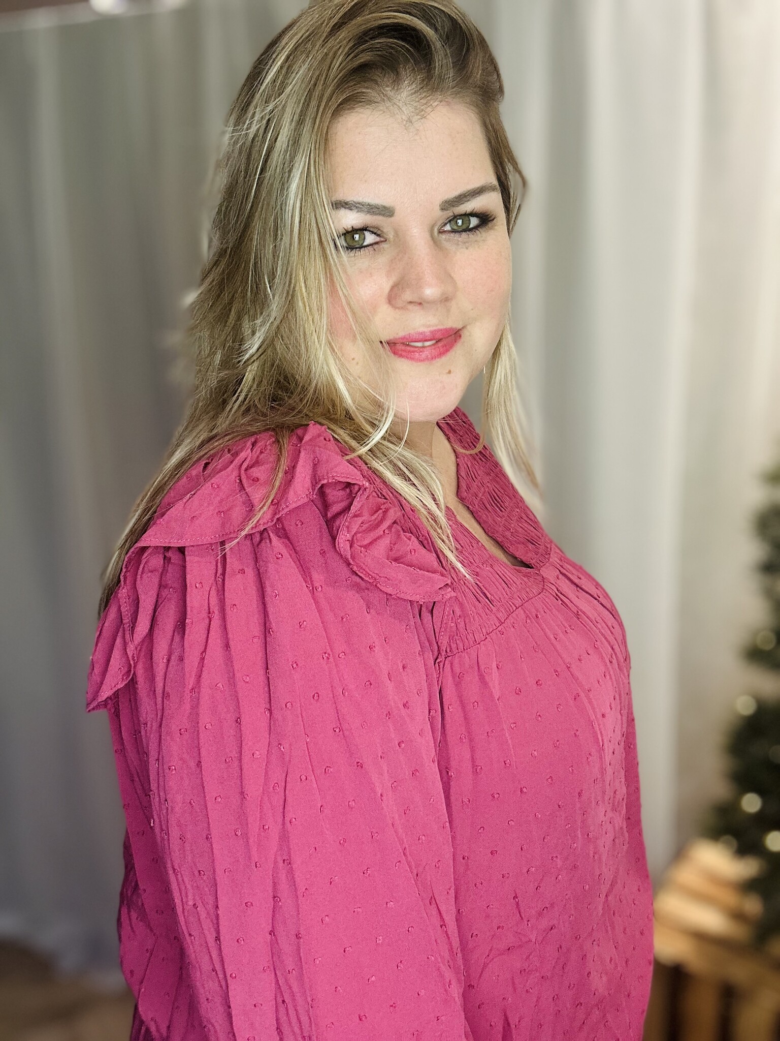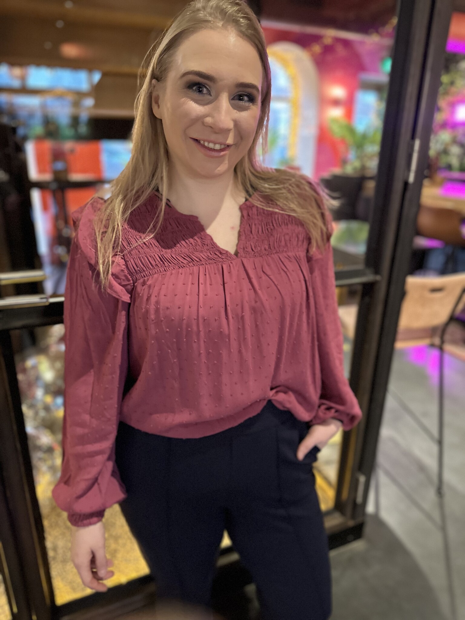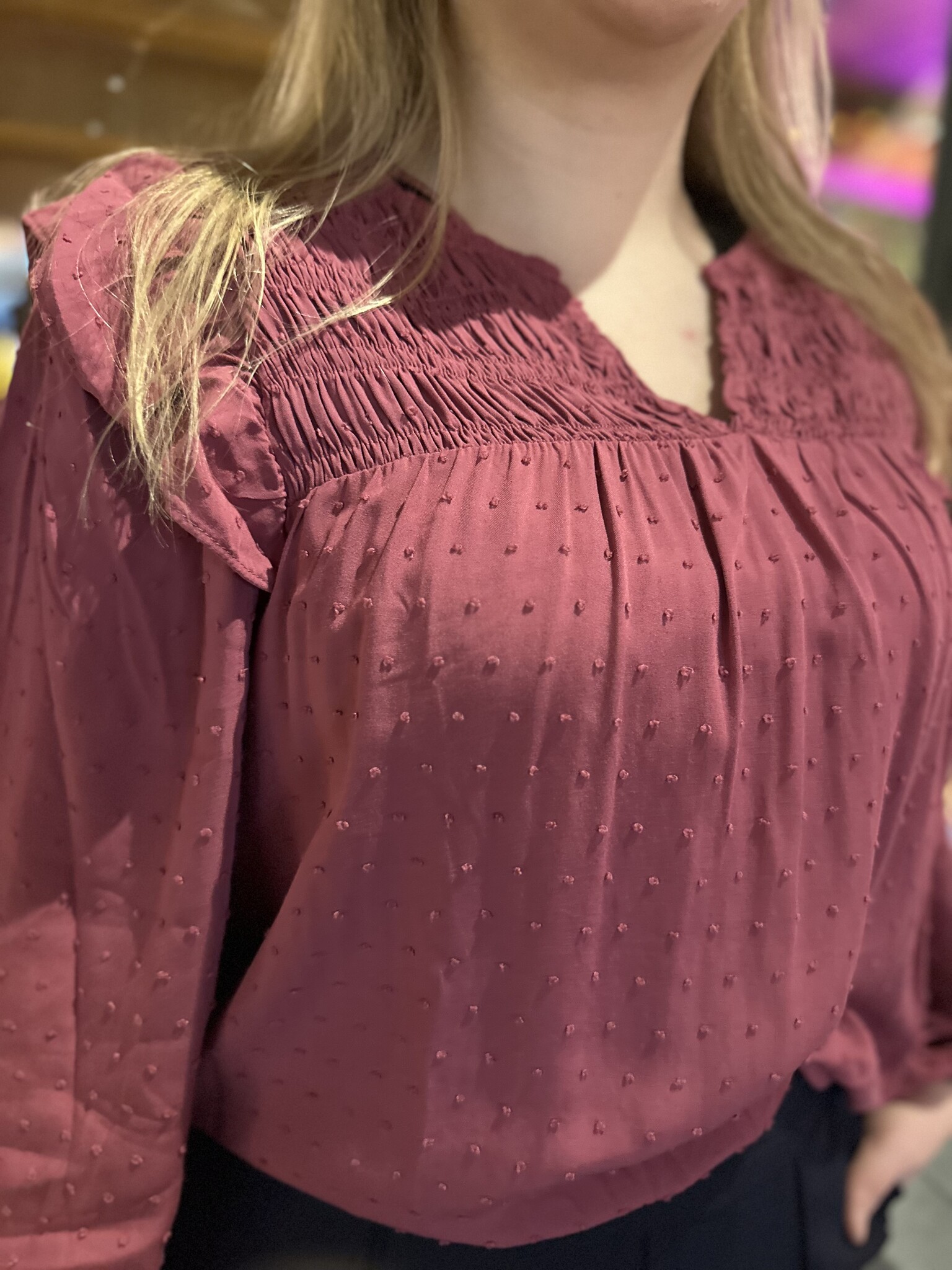 CARLIDA LS V-NECK SMOCK TOP WVN Rose Wine