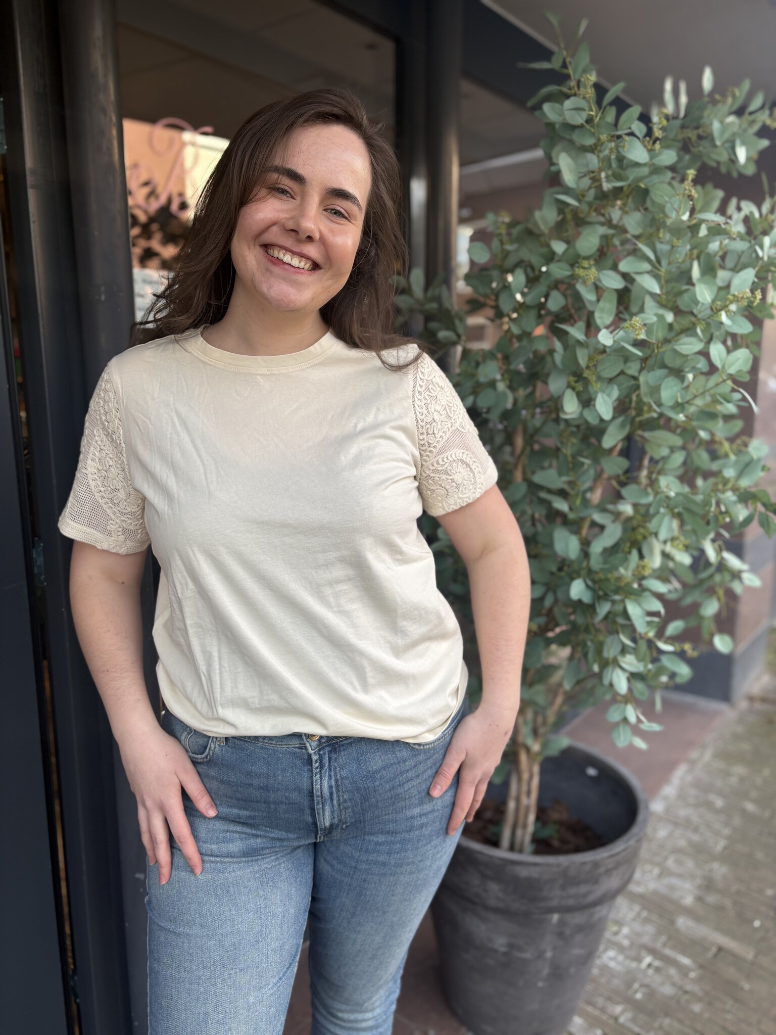 Dit heerlijke katoenen shirt van Only Carmakoma is beschikbaar van maat 42/44 tot 54. Met de leuke kanten mouwen haal je met dit shirt een elegante item in huis voor in het voorjaar en de zomer.