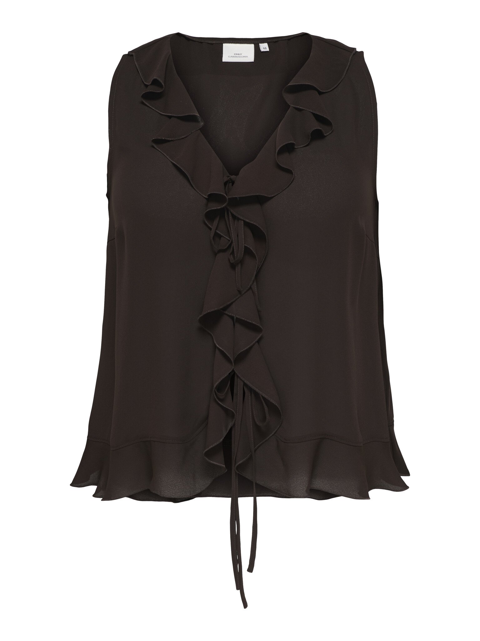 Deze bruine top van Only Carmakoma heeft een normale pasvorm. Gemaakt van een luchtige stof die zorgt voor een fijn draagcomfort. De top is afgewerkt met een elegante V-hals met ruches. Aan de onderkant heeft deze mouwloze top een lichte volant laag. Perfect te combineren met een blazer voor een nette look.