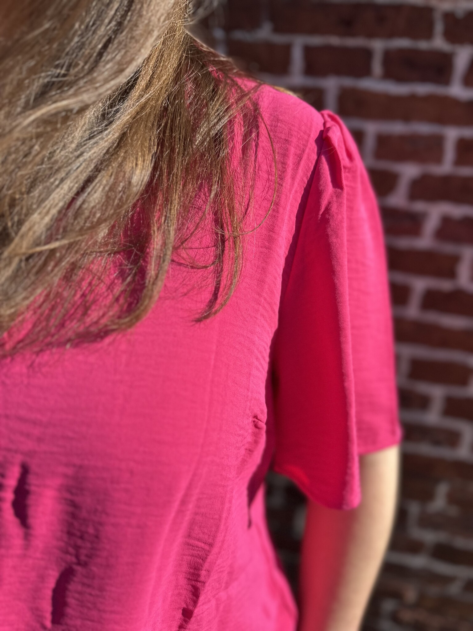 Deze leuke blouse in een prachtige fuchsia kleur is echt een eyecatcher! Met een vrouwelijke V-hals en een subtiele kleine pofmouw krijgt de blouse een speelse en elegante uitstraling. Gemaakt van 51% recycled polyester en 49% polyester – dus niet alleen stijlvol, maar ook een iets duurzamere keuze. Valt mooi en is perfect om zowel casual als chic te dragen.
