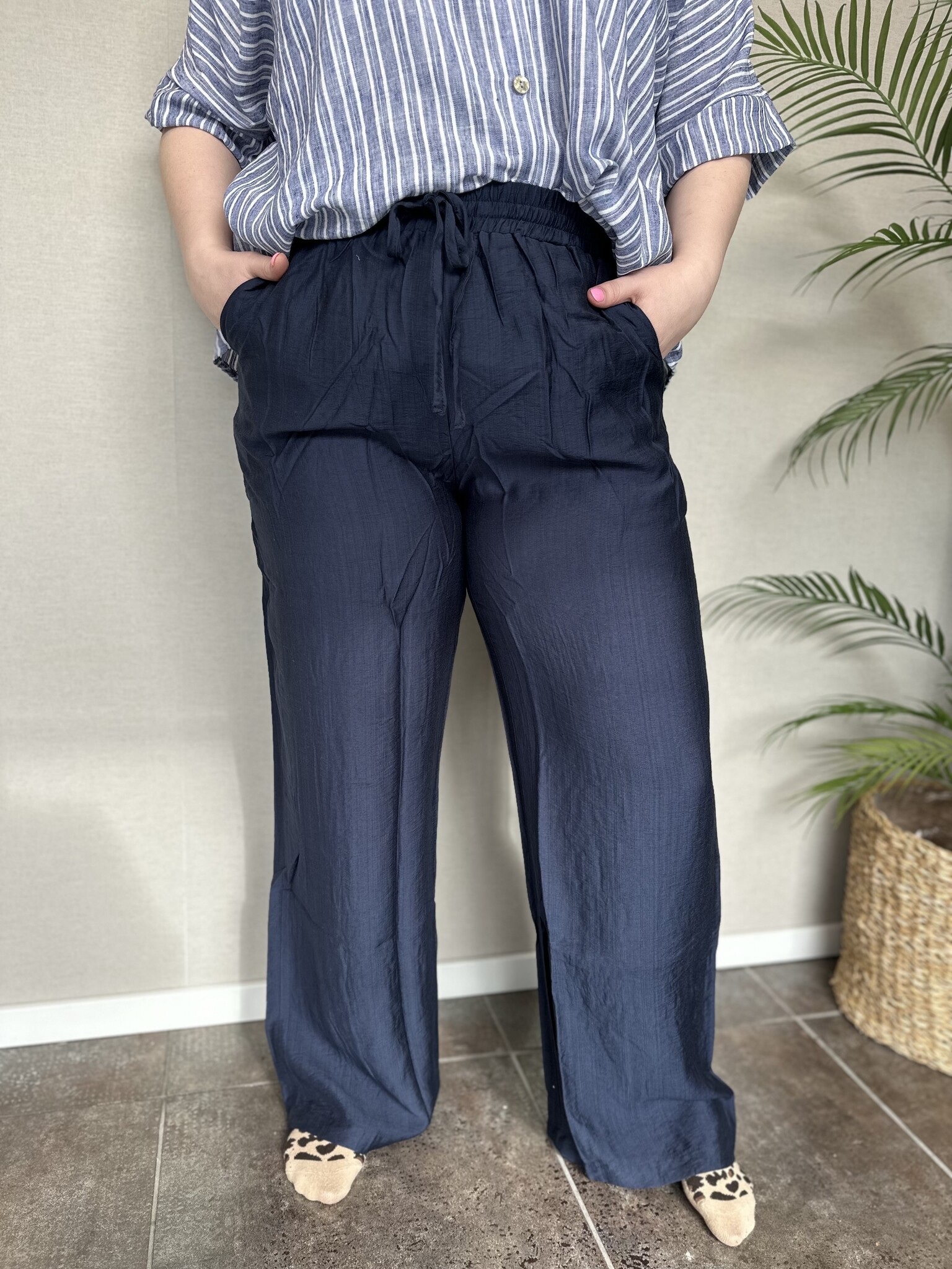 Deze donkerblauwe broek van Only Carmakoma zit comfortabel en heeft een losvallende pasvorm. De broek heeft een mooie donkerblauwe kleur. Gemaakt van een luchtige stof dat zorgt voor een fijn draagcomfort. De broek is heeft wijduitlopende pijpen en een elastische taille met koordjes om strakker te trekken. Een casual broek die leuk te combineren is met een top!