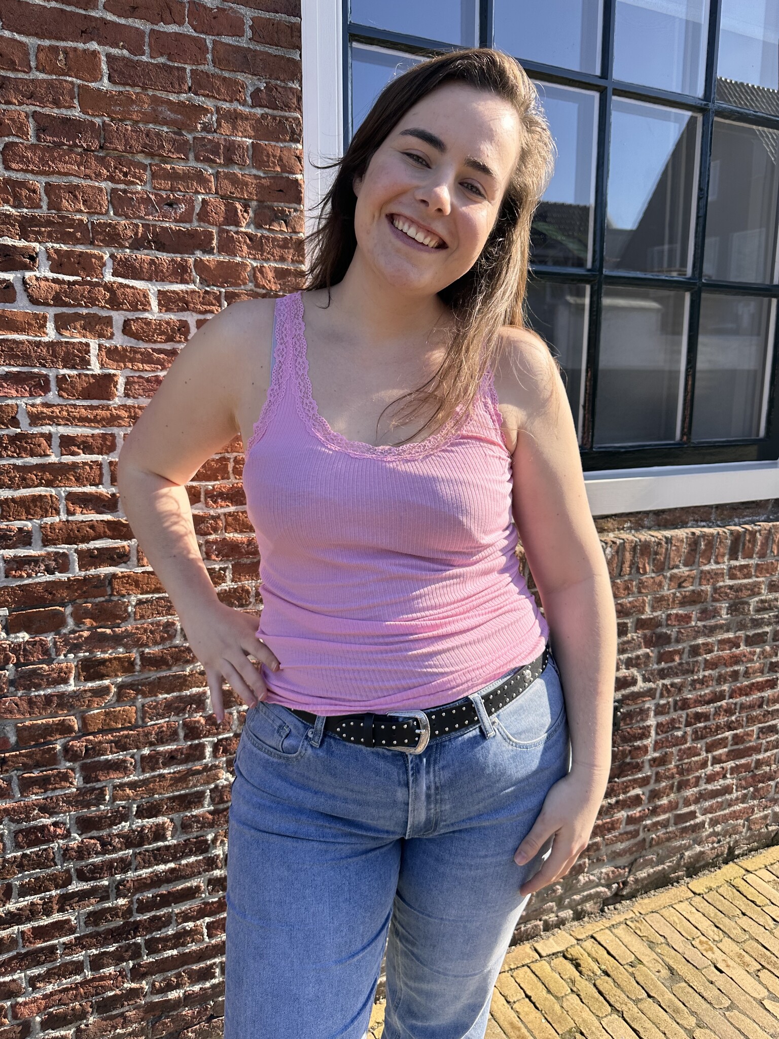 Mooie rib stoffen top met een ronde hals en kant als afwerking. We hebben ze verkrijgbaar in verschillende kleuren in onze webshop en winkel. De tops vallen goed op maat en zijn stretchy.De stof is 94% Cotten en 6% Elastane