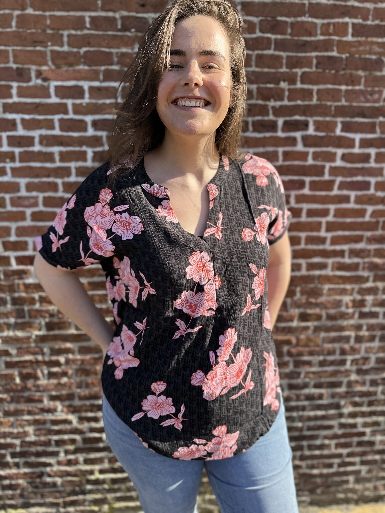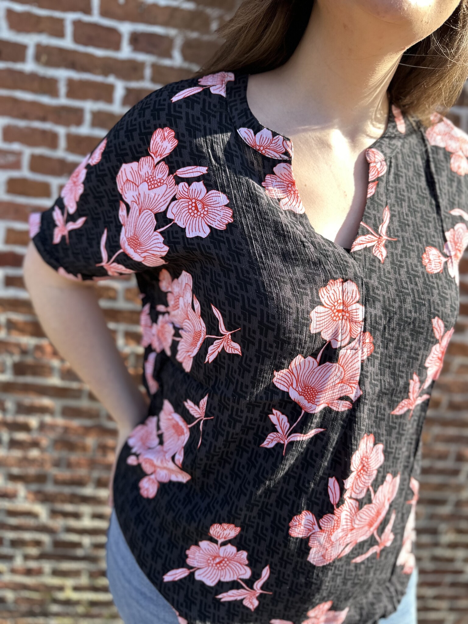 Deze blouse van 100% viscose is een echte musthave! De combinatie van zwart met roze en rood geeft een speelse, maar elegante uitstraling. Dankzij de V-hals oogt hij vrouwelijk en flatterend. De stof voelt heerlijk zacht en luchtig aan en valt mooi soepel om het lichaam. Bovendien valt hij goed op maat. Perfect voor zowel een casual als geklede look.