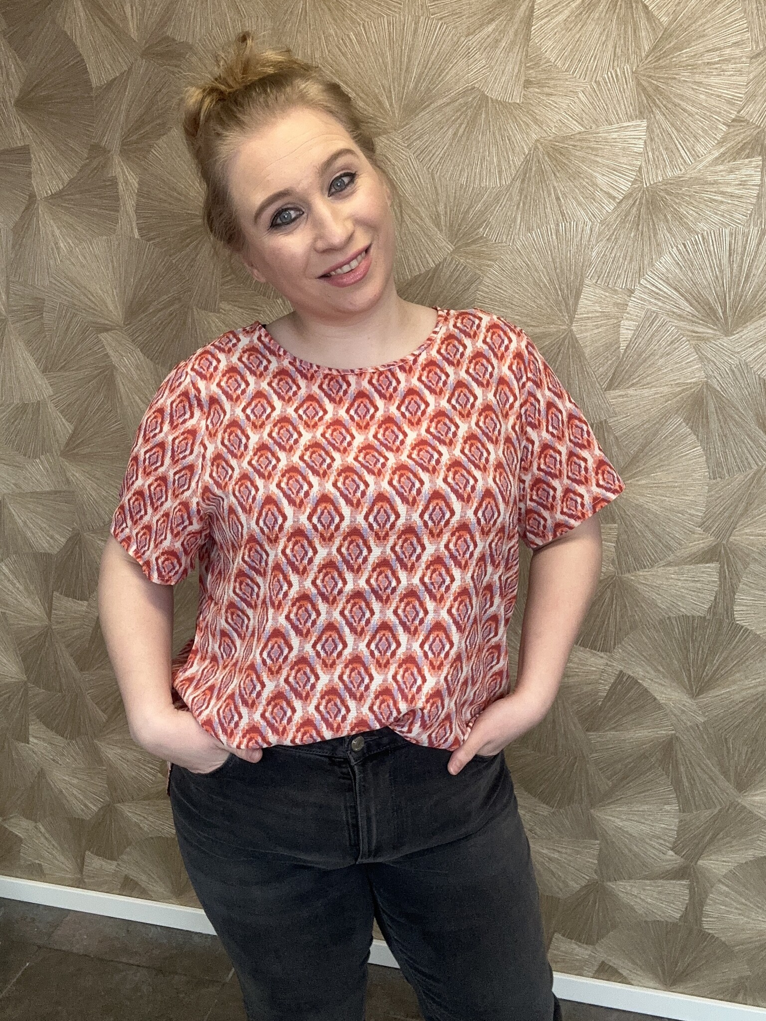 De soepelvallende stof en comfortabele pasvorm zorgen ervoor dat de top mooi langs je curves valt, zonder strak te zitten. De korte mouwen maken ’m ideaal om het hele jaar door te dragen — los in de zomer of gecombineerd met een vest of blazer in de koelere maanden.