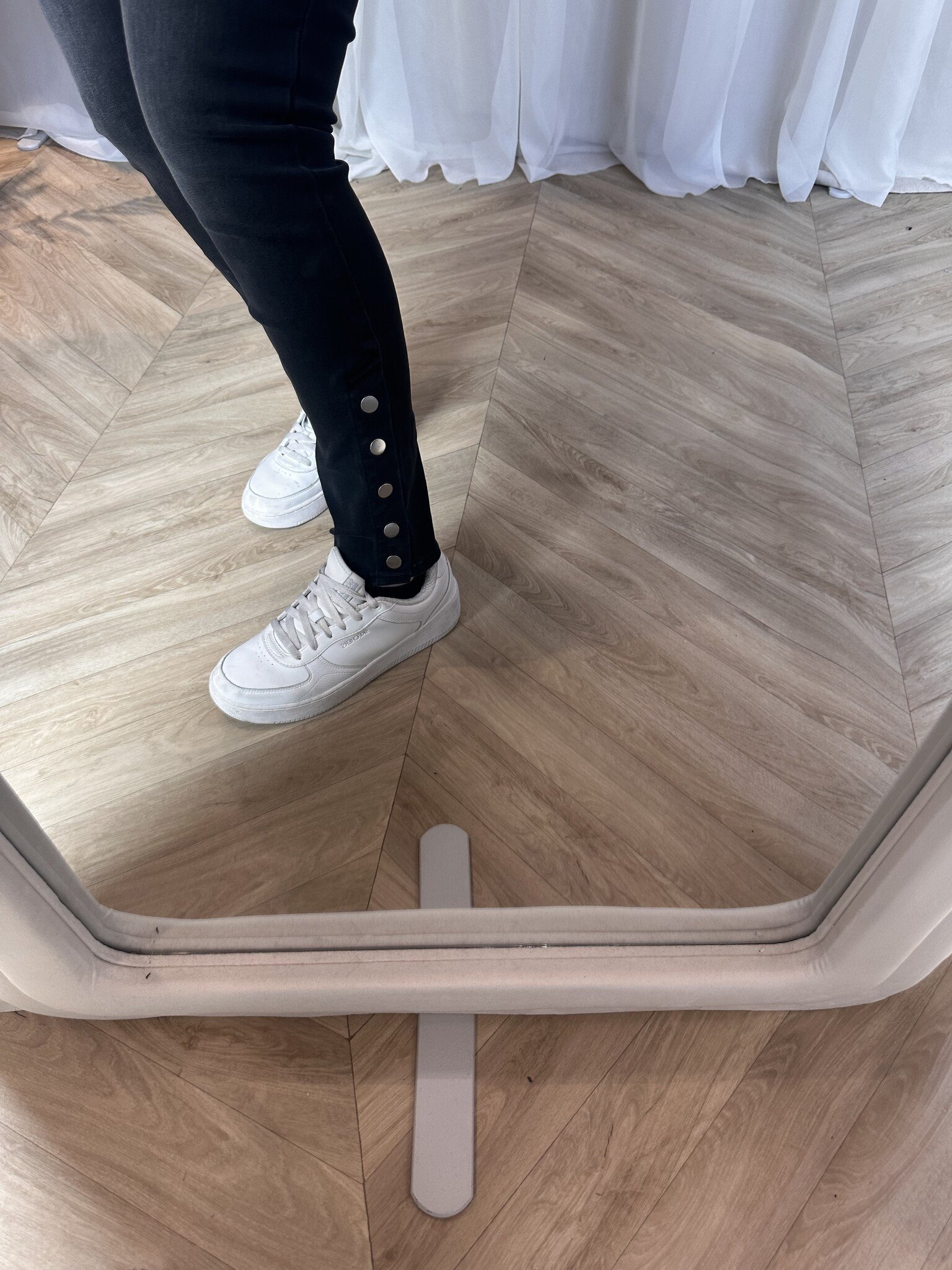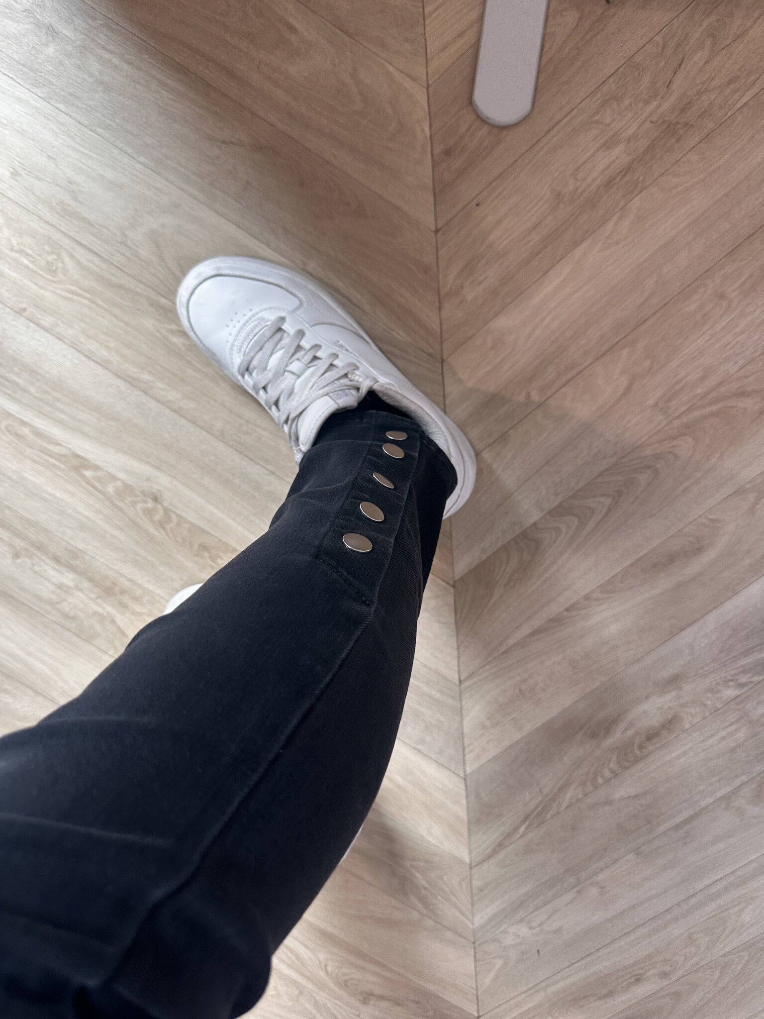 De zilveren knopen onderaan de pijpen geven deze broek een speelse en trendy touch