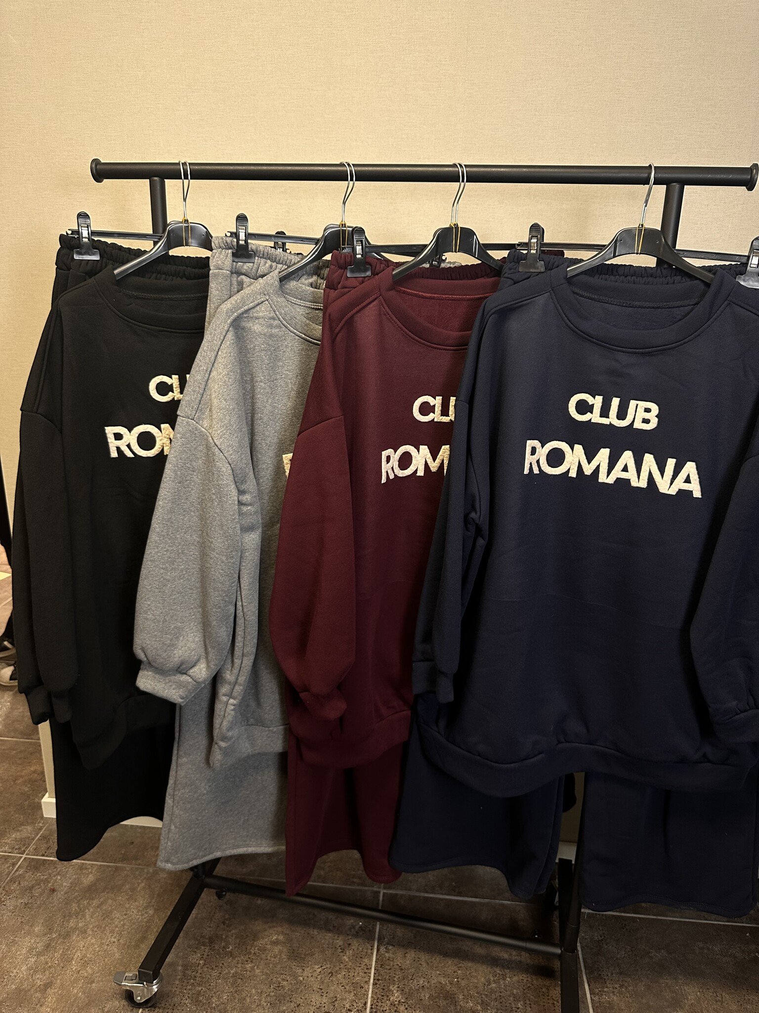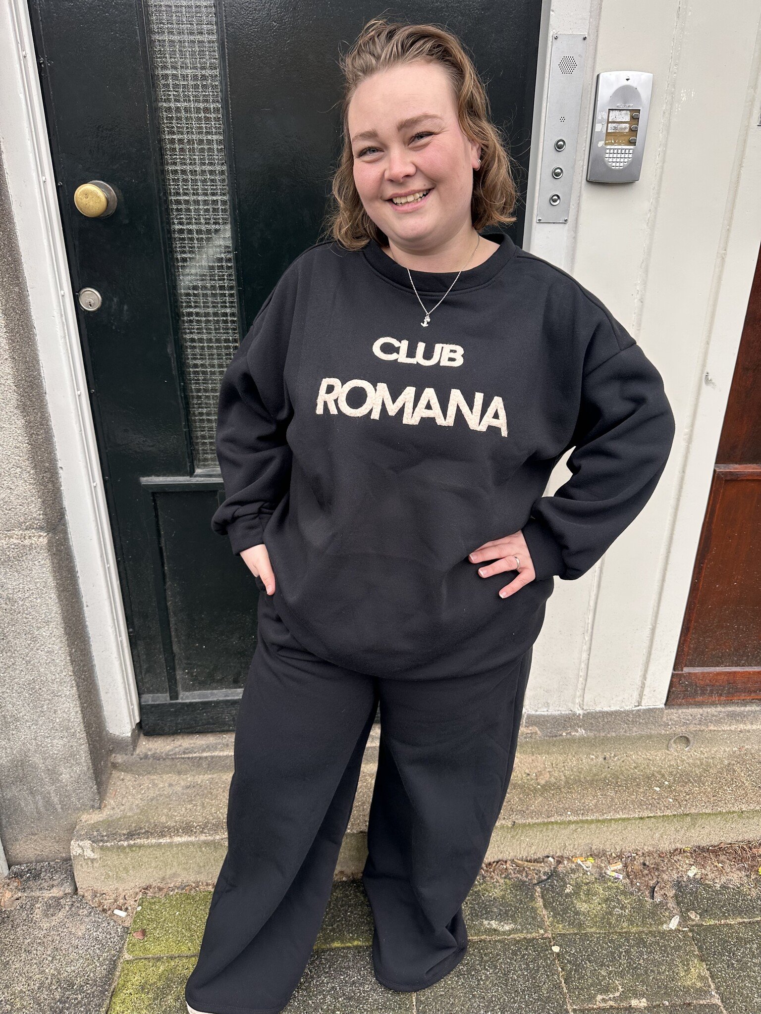 Dit leuke pak Mallorca met heerlijke fleece voering aan de binnenkant is beschikbaar in de kleuren: zwart, grijs, wijnrood en donkerblauw. Op de borst staat de tekst ‘Club Romana’. De sweater heeft een band aan de onderkant en bij de mouwen. Deze sweater valt lekker lang en de bijpassende broek heeft een wijde pasvorm. Een heerlijk comfortabel pak dat met een leuke sneaker casual te dragen is.