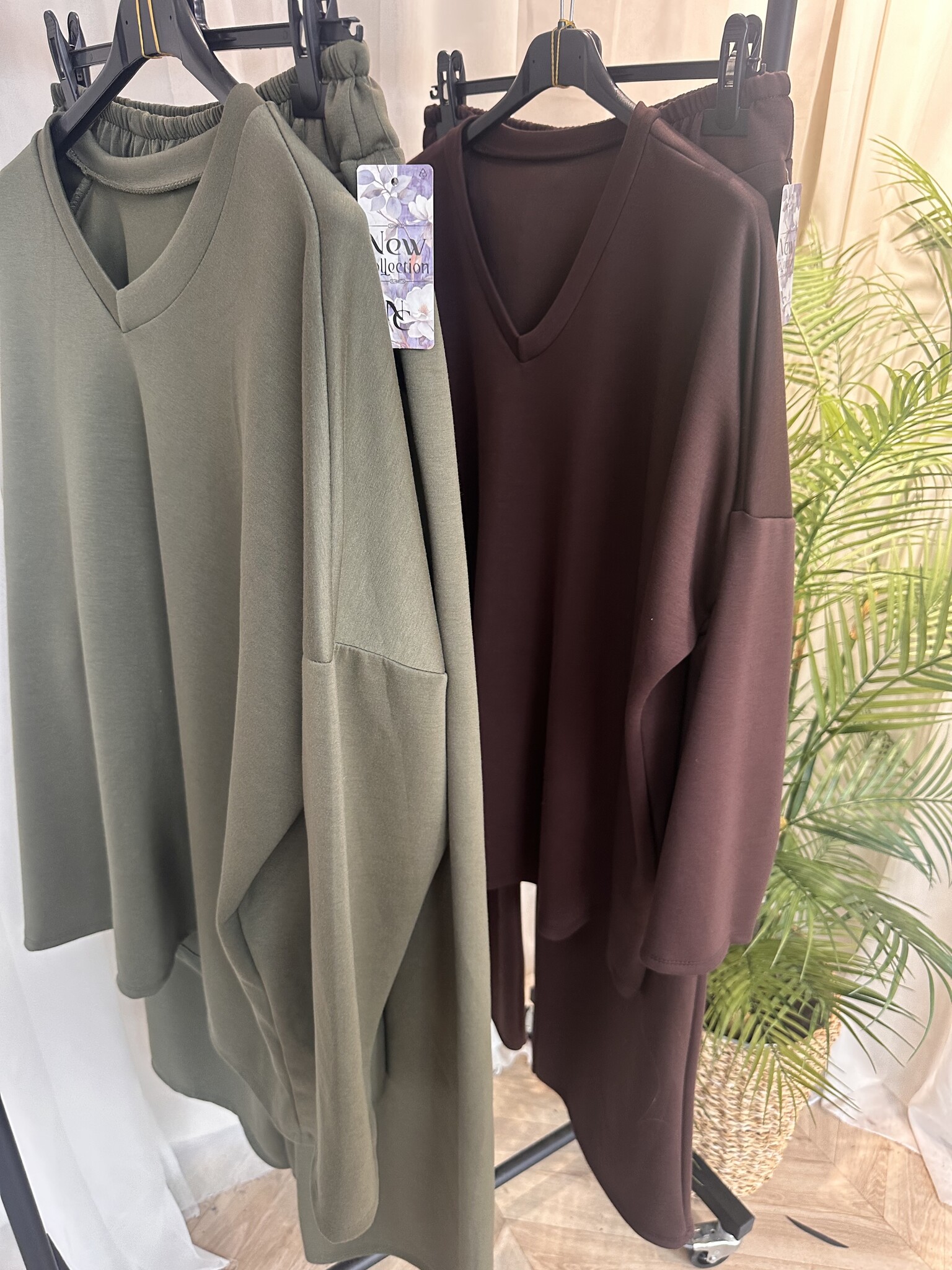 Dit heerlijke pak van scubba stof in trendy army groen is comfortabel, zacht en blijft mooi in model. De stretchstof zorgt voor optimaal draagcomfort en een elegante uitstraling.