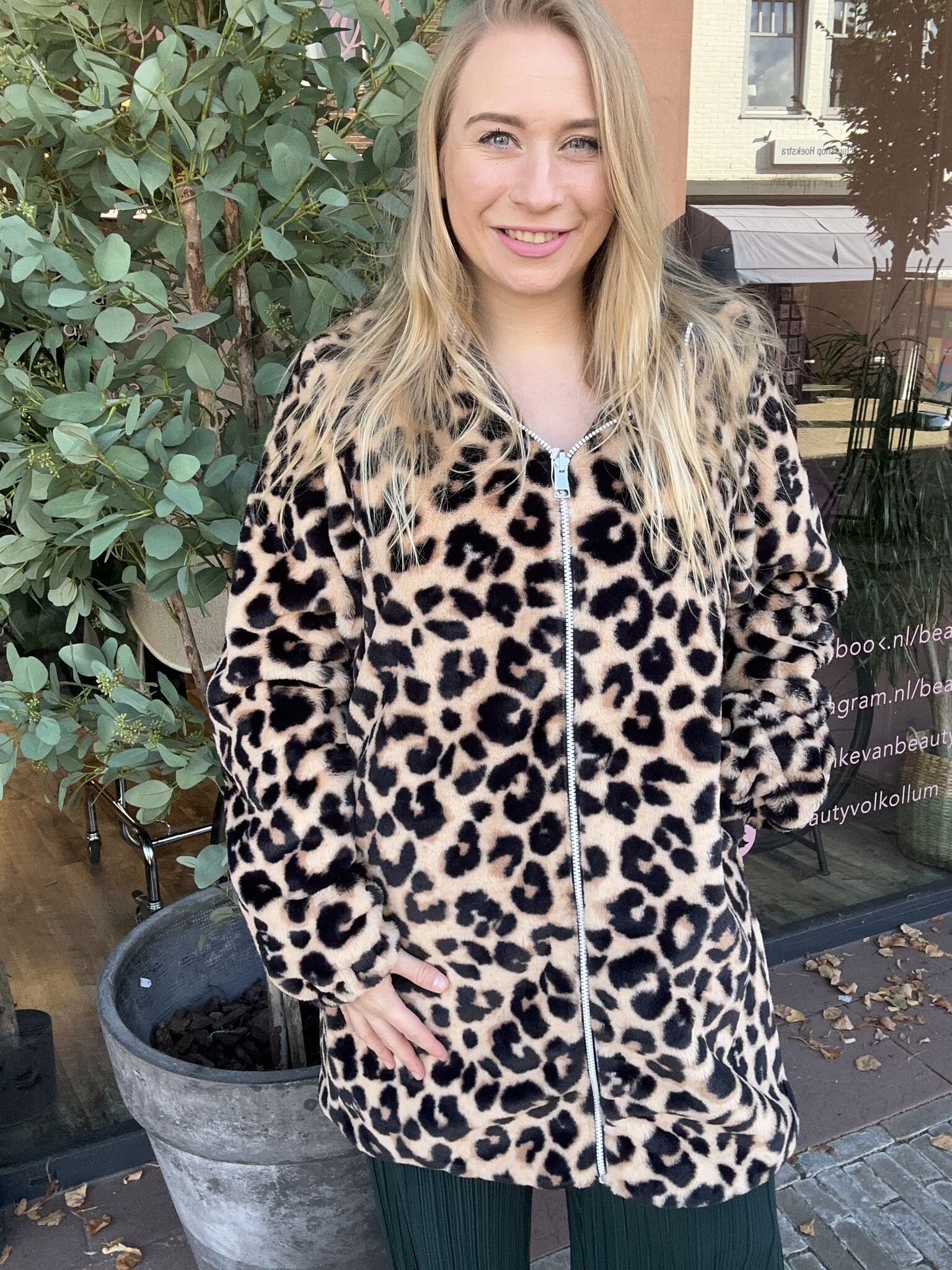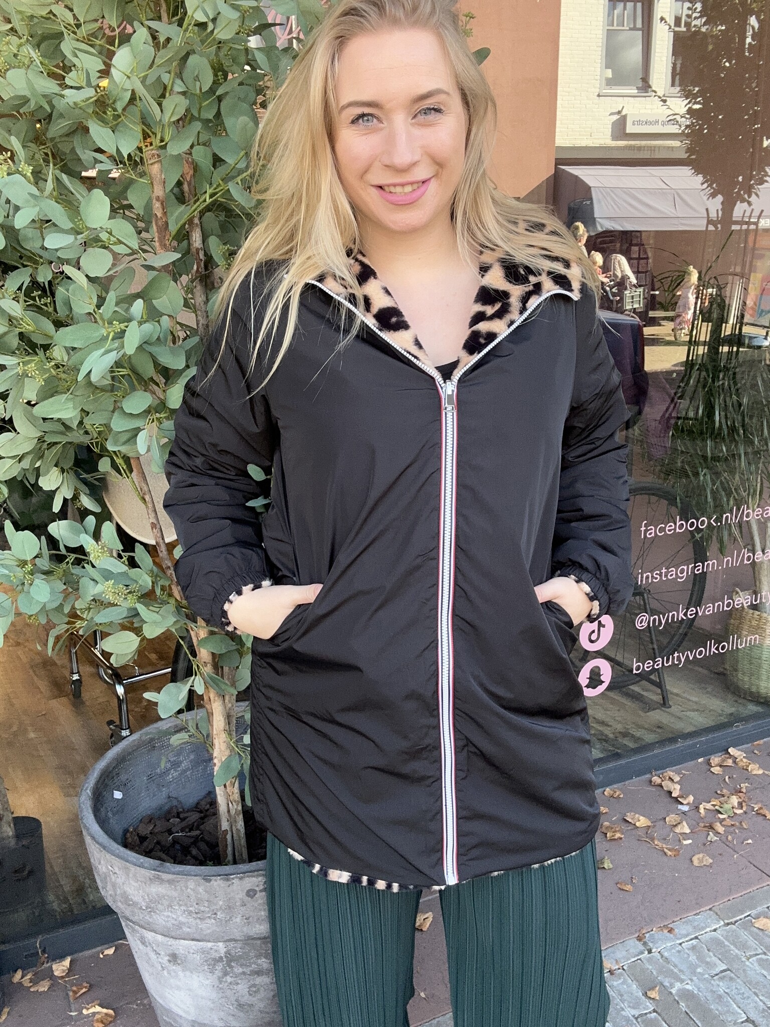 Deze reversible winterjas geeft je twee looks in één! De ene kant heeft een stoere zachte panterprint, de andere kant een elegante zwarte stof. De jas valt goed op maat, is heerlijk warm en perfect om je winteroutfits een fashionable touch te geven.