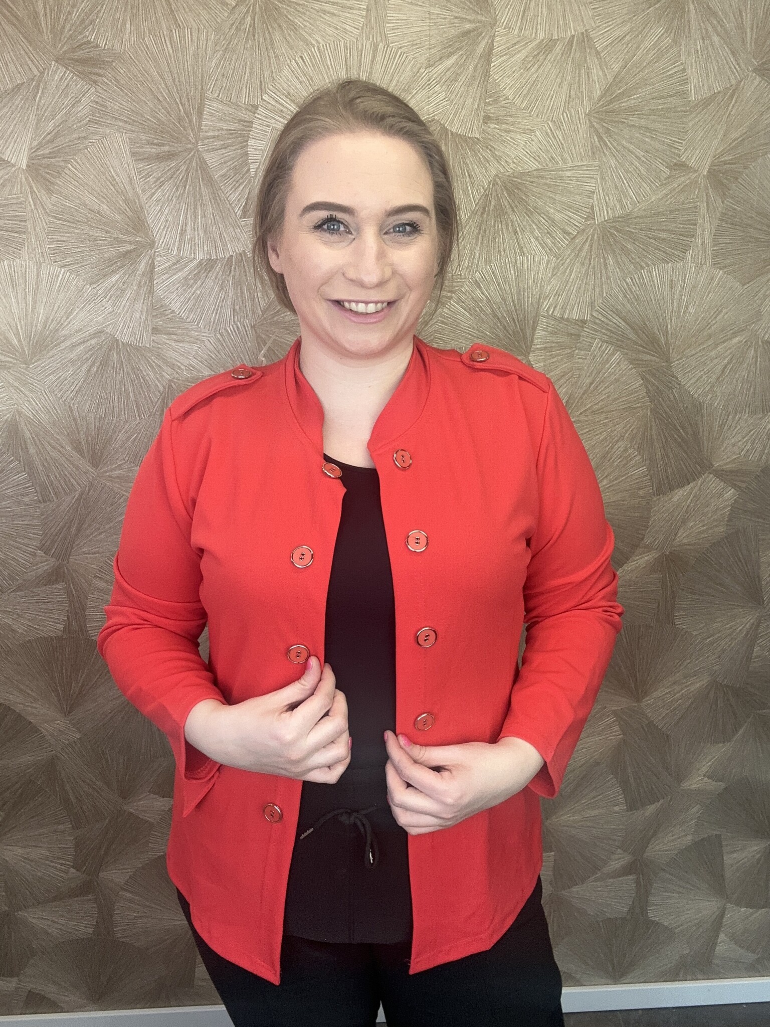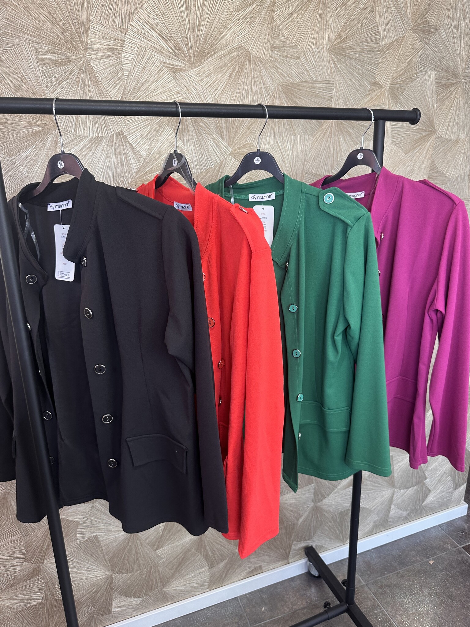 Met dit jasje van Magna Fashion maak je elke outfit elegant! Dit jasje heeft epauletten op de schouders. Op de voorkant heeft het jasje decoratieve knopen en flappen. Combineer met een mooie blouse uit de Magna Collectie voor een volledige outift!