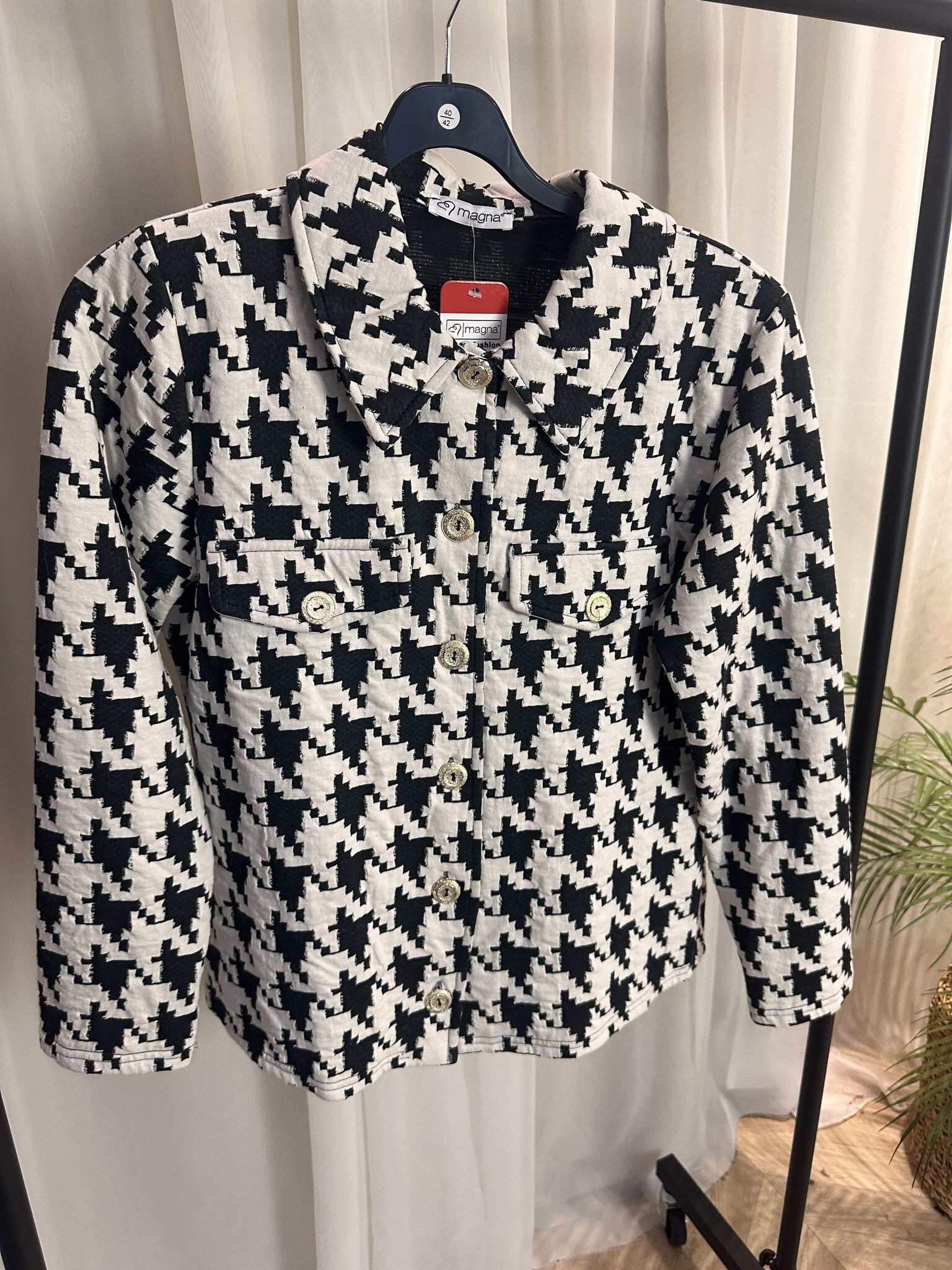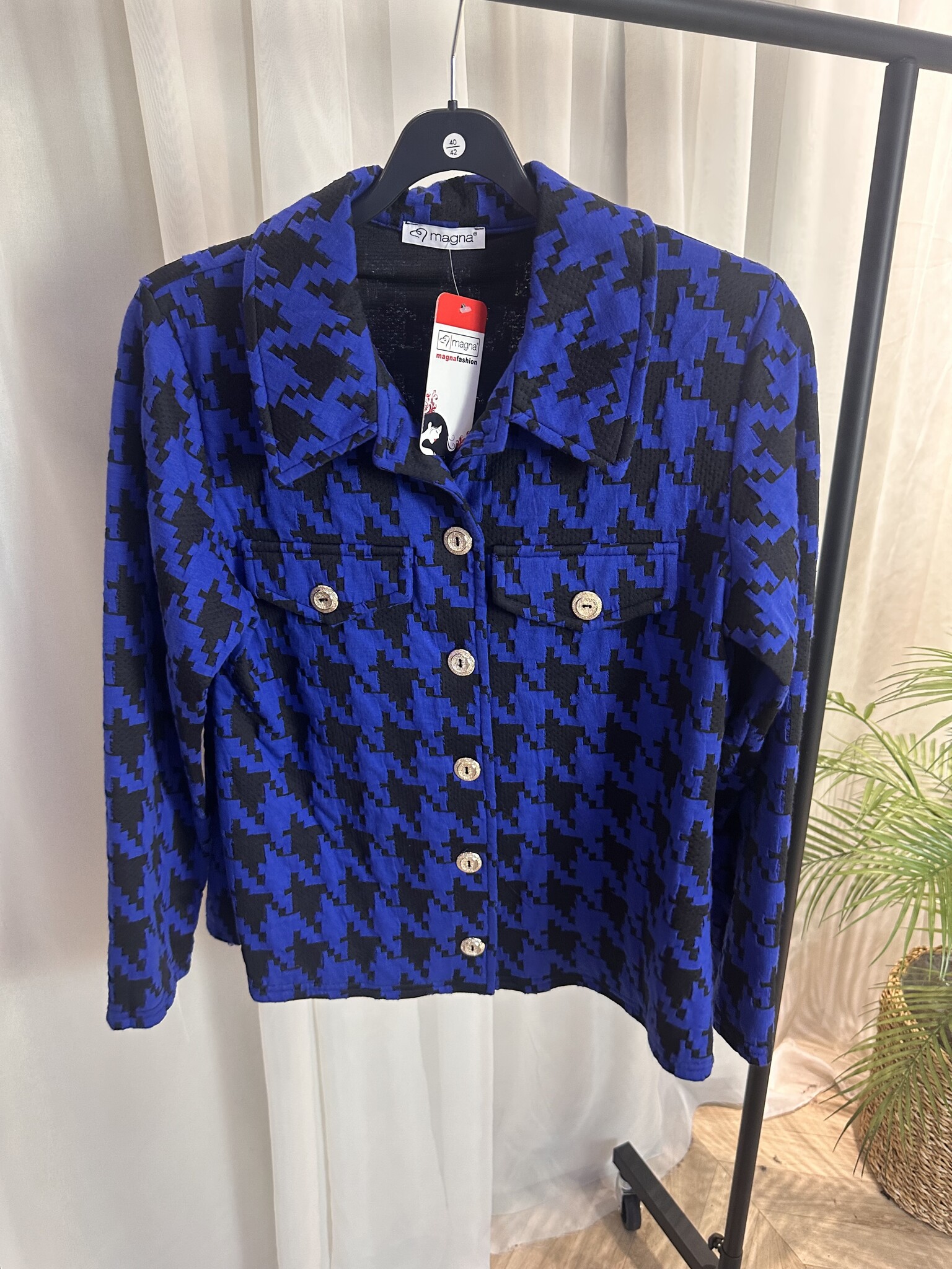 Voel je zelfverzekerd en stijlvol in dit geweldige jasje van Magna Fashion. Het heeft een mooie structuur of een opvallende print die elke outfit een luxe uitstraling geeft. De gouden knopen zorgen voor een chique detail, terwijl de vrouwelijke pasvorm mooi afkleedt en je figuur prachtig laat uitkomen.
