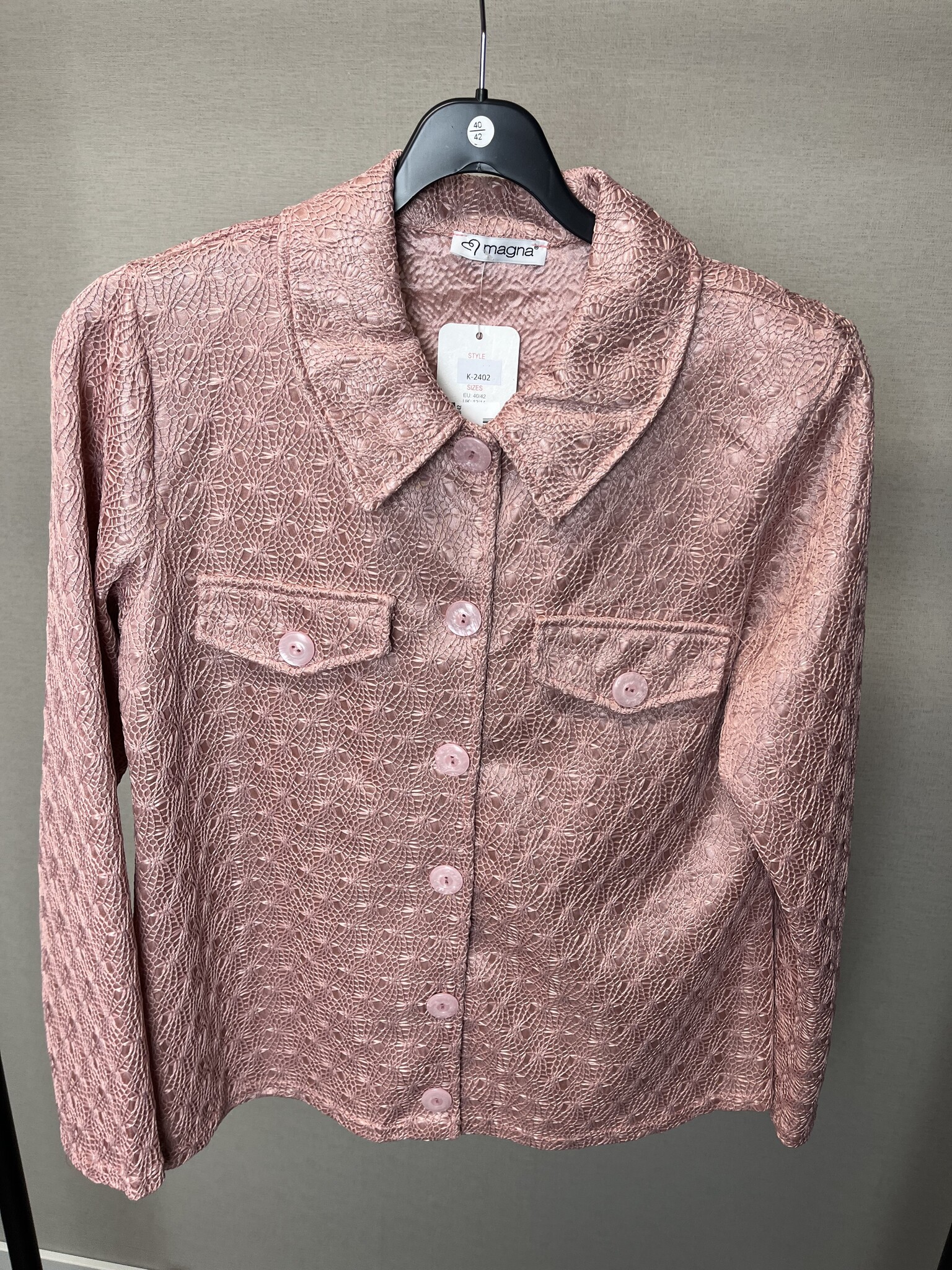 Op zoek naar een elegant jasje? Dit jasje van Magna Fashion heeft een mooie lichtroze kleur met subtiel ingeweven speelse print. Gemaakt van een stevige stof voor een luxe uitstraling. Afgewerkt met knoopsluiting en 2 neppe borstzakjes met knopen.