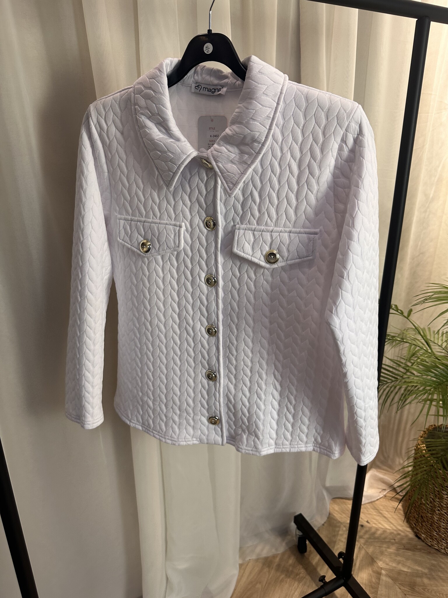 Voel je zelfverzekerd en stijlvol in dit geweldige jasje van Magna Fashion. Het heeft een mooie structuur of een opvallende print die elke outfit een luxe uitstraling geeft. De gouden knopen zorgen voor een chique detail, terwijl de vrouwelijke pasvorm mooi afkleedt en je figuur prachtig laat uitkomen.