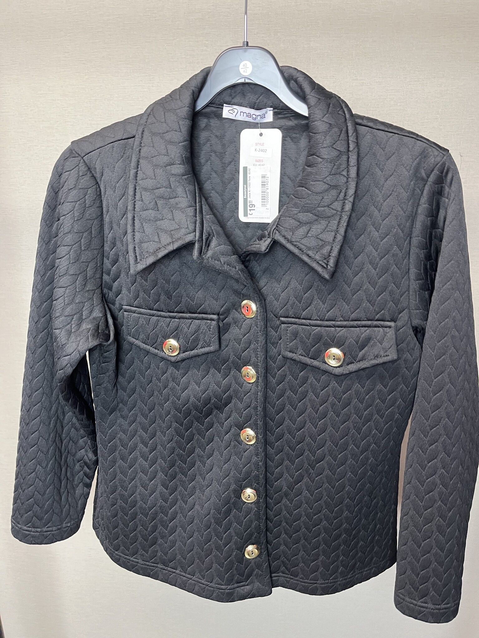 Dit zwarte jasje van Magna Fashion heeft een luxe uitstraling! Gemaakt van een stevige stof die zorgt voor een fijn draagcomfort. Dit jasje is afgewerkt met een gouden knoopsluiting en twee neppe borstzakjes met gouden knoop. Een elegant jasje dat leuk te combineren is met een broek!