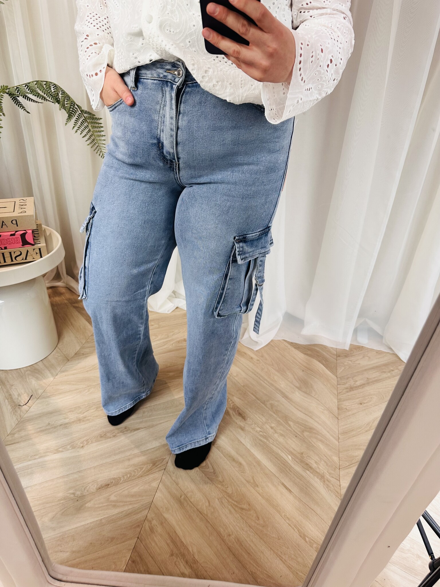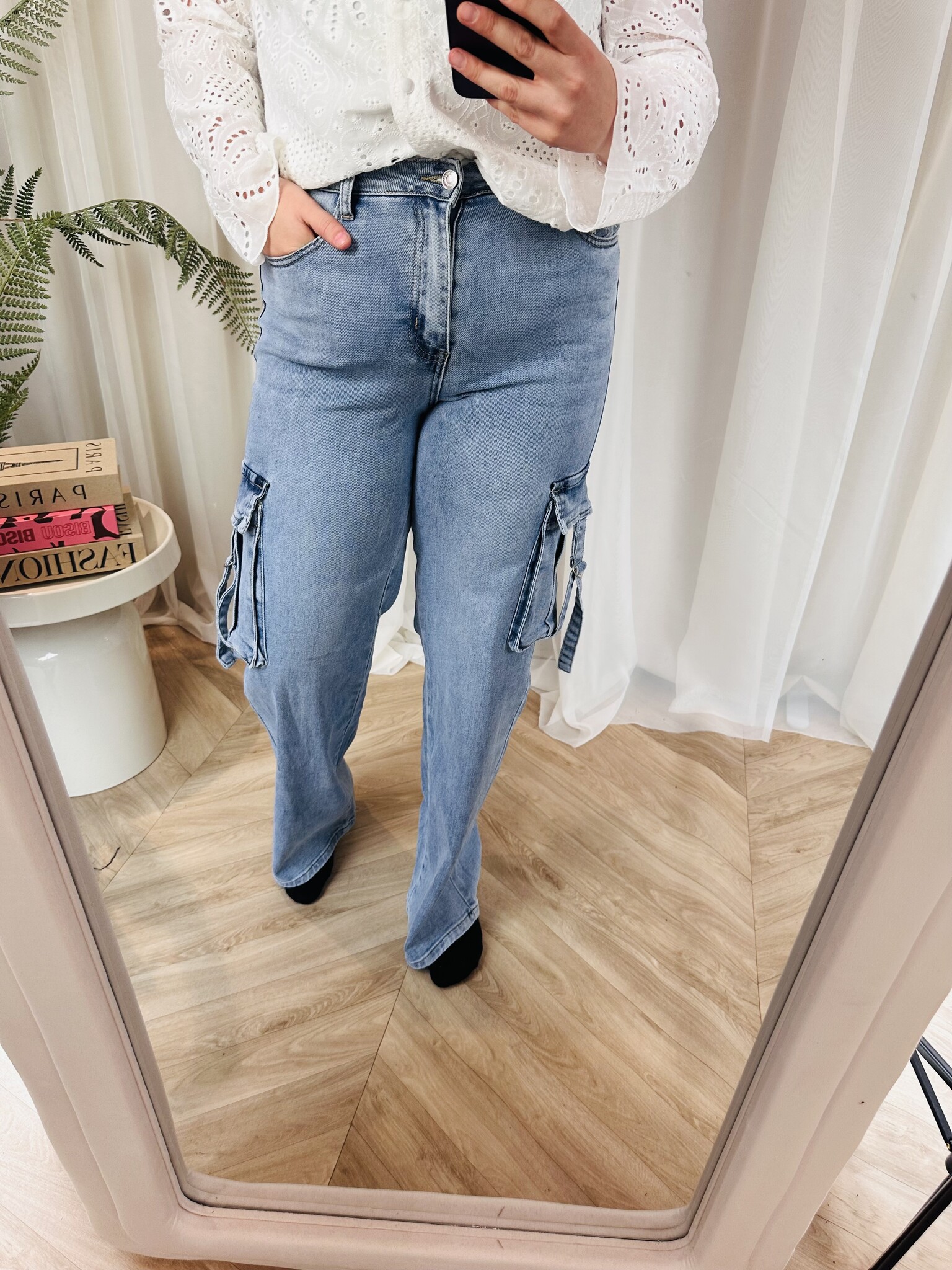 Prachtige Cargo jeans broek, met dus leuke zakken op de zijkant en gespen in de taille. Valt mooi hoog en zit heerlijk.