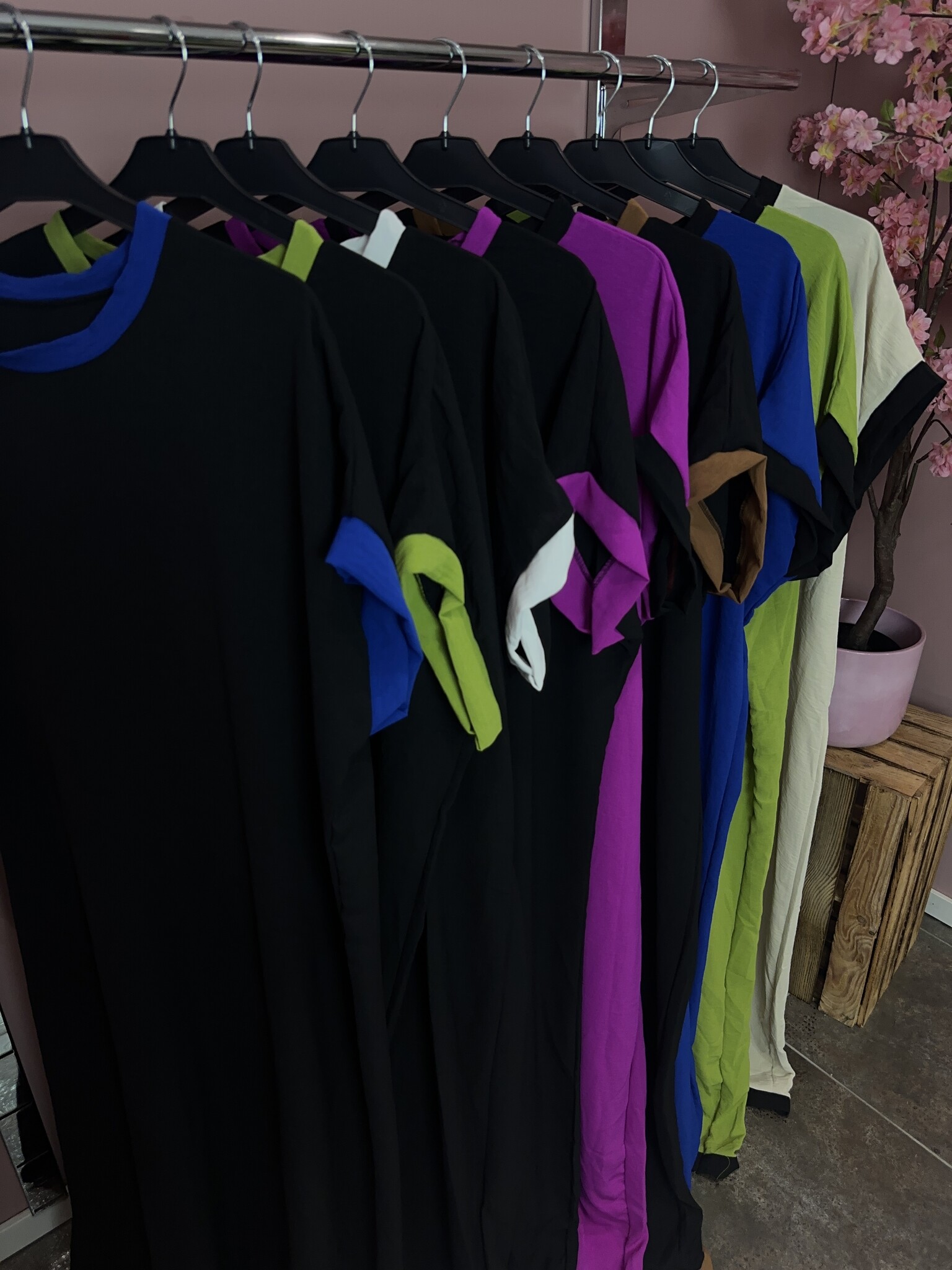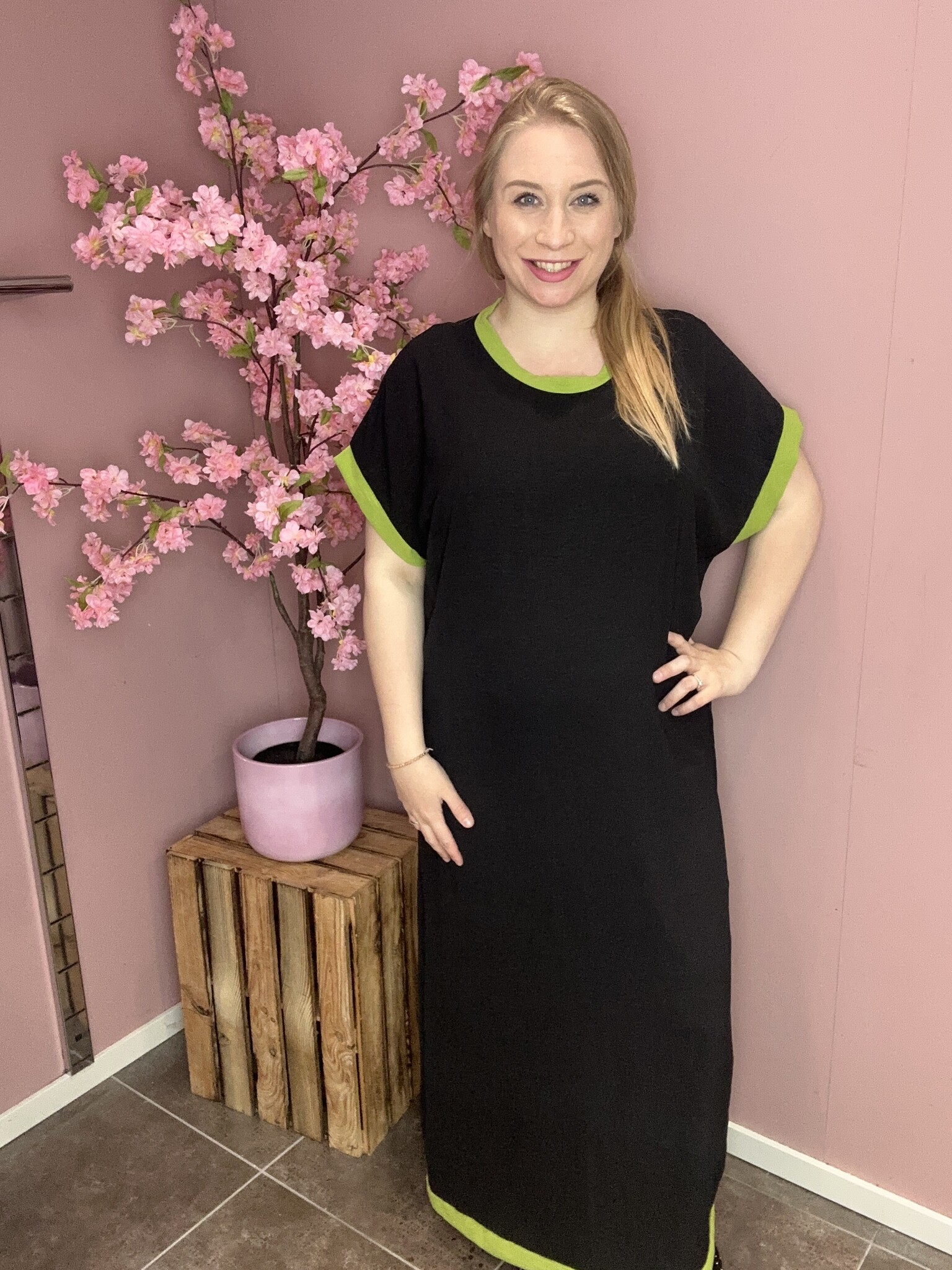 Kies je kleur + rand kleur, dus bestel je zwart/magenta? dan heb je de zwarte jurk met magenta randjes.
