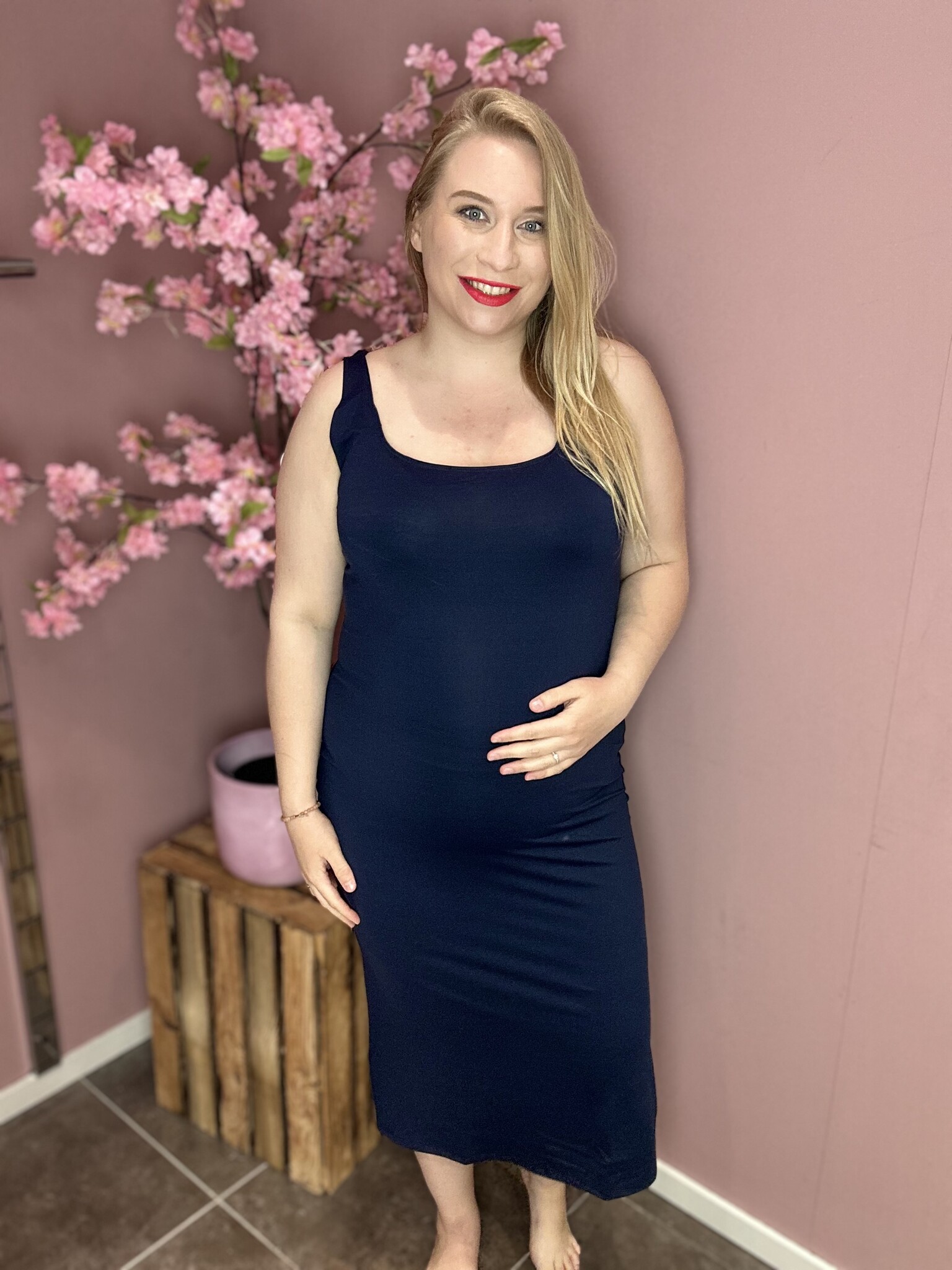 Het is een aangesloten jurk, neem een maatje groter dan je eigen maat.