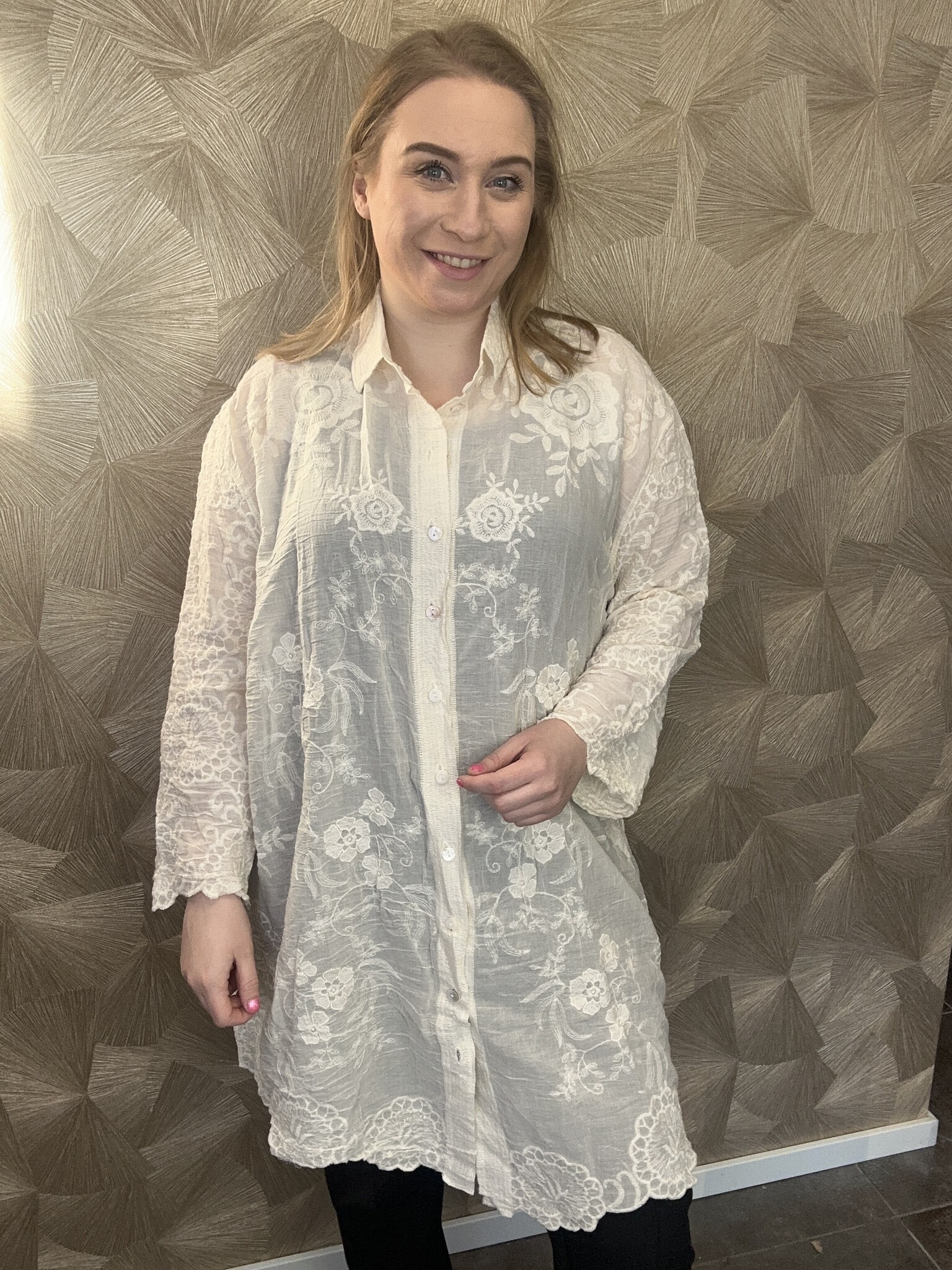Deze blousejurk Anje is een elegante jurk in een crèmekleur met een mooi geborduurd bloemenpatroon. Anje is golvend afgewerkt in de mouwen en aan de onderkant. Een leuk item om zowel als jurk te dragen of met de knopen los! Probeer eens in de taille een riem te dragen voor een accent op je taille.