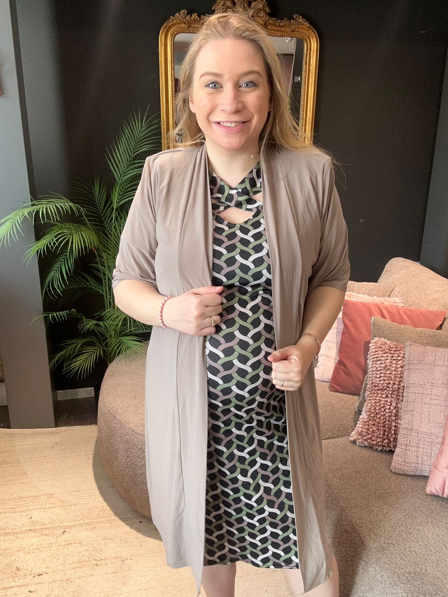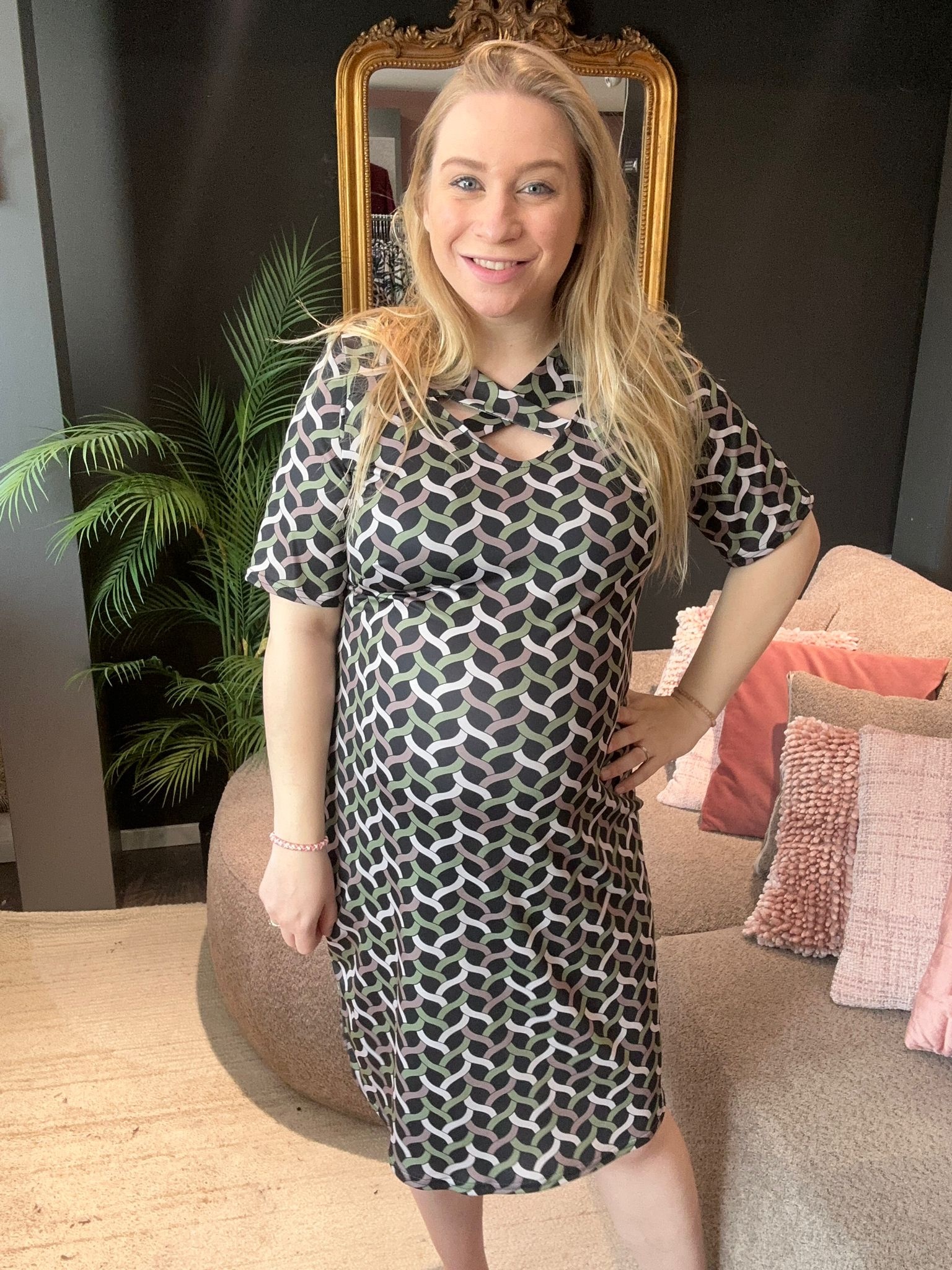 Magna Fashion - Super leuk jurkje met vintage groene en taupe print. De jurk heeft een mooi kruis detail op de borst.