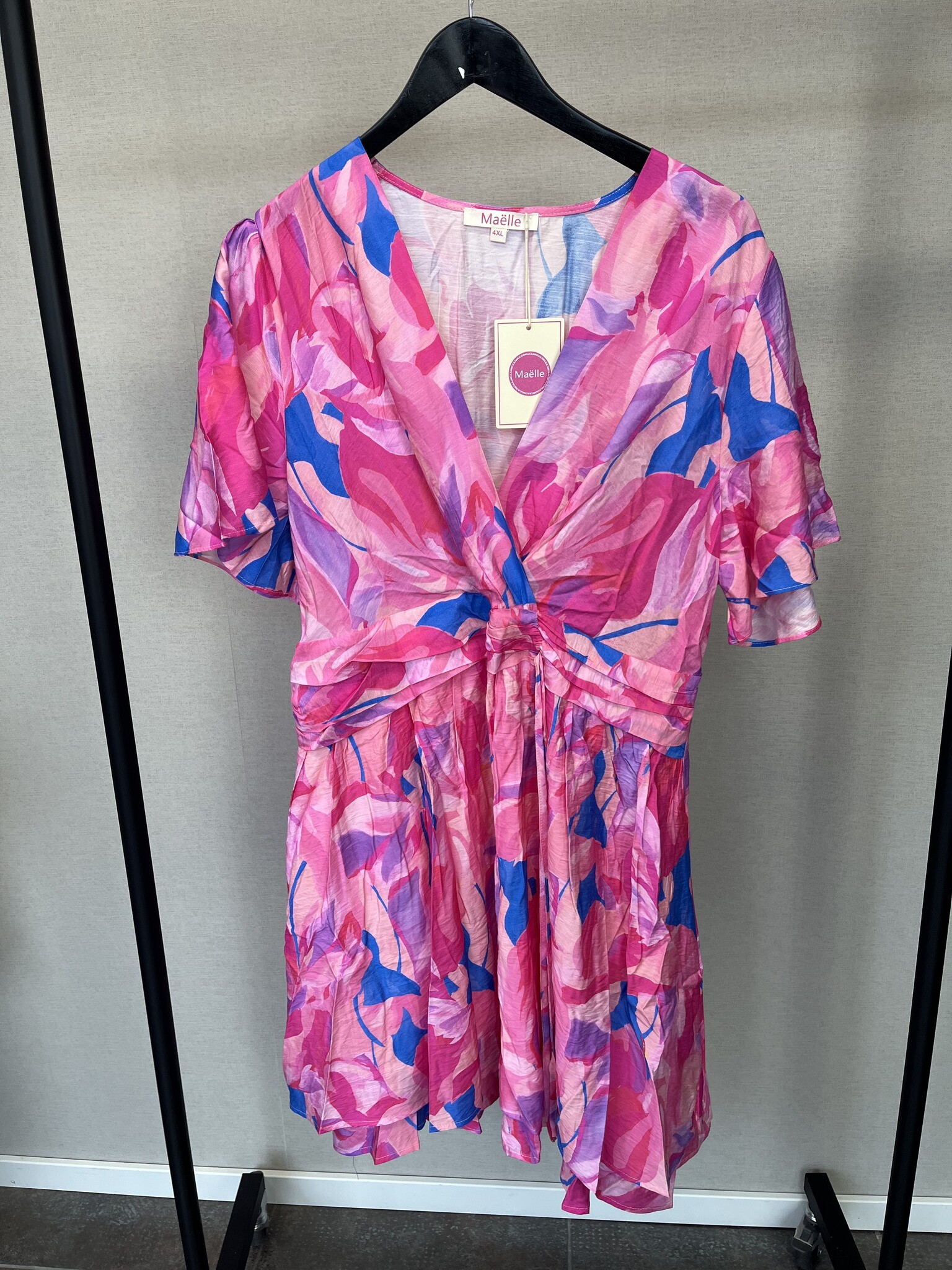 Deze korte jurk van Maëlle valt mooi en heeft een losvallende pasvorm. De jurk heeft een mooi roze print met blauwe accenten. Gemaakt van een luchtige stof dat zorgt voor een fijn draagcomfort. De jurk is afgewerkt met diepe hals en een een elegante elastische taille. Perfect voor een elegante look!
