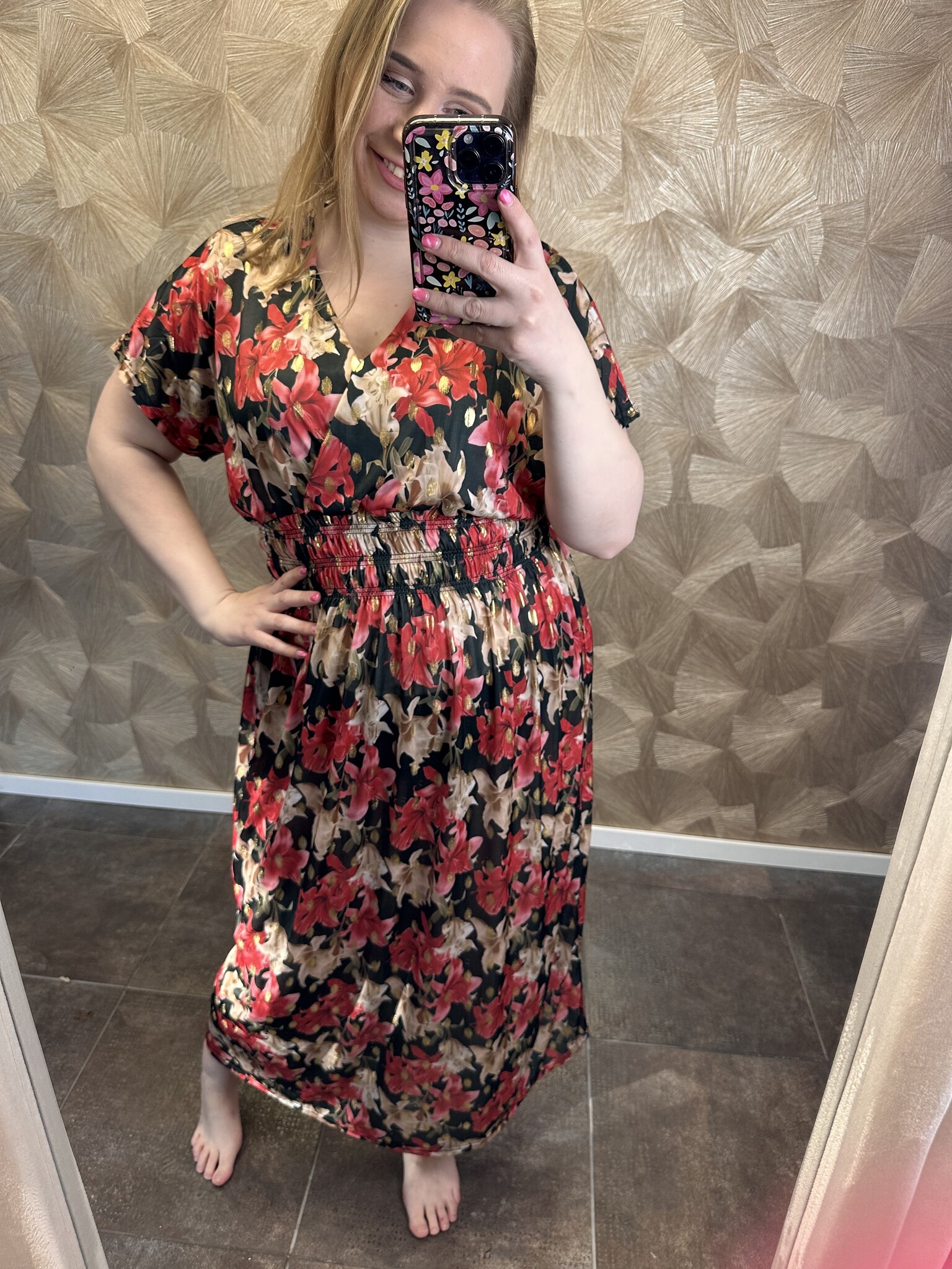 Deze jurk van Beautyvol is een fijn item voor elke zomerse dag. De jurk heeft een mooie bloemenprint met een gouden glitter in meerdere kleuren en heeft een los model. De gladde stof zorgt voor een prettig draagcomfort. Voorzien van een v-hals, de schouders kun je dunner trekken en er zit elastiek onder de borsten.