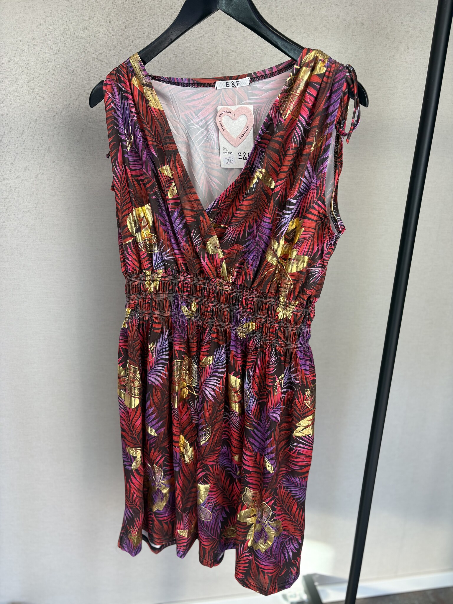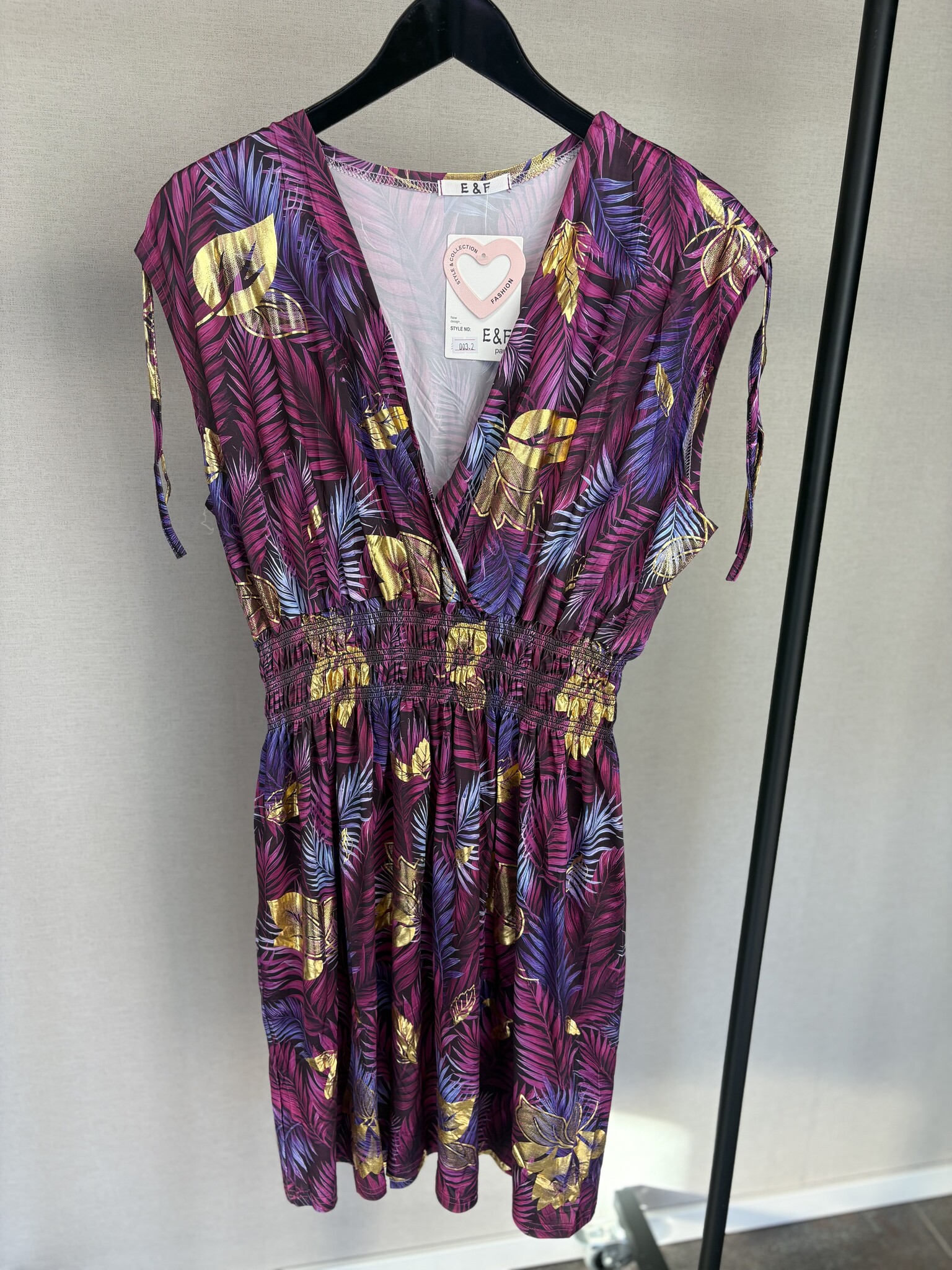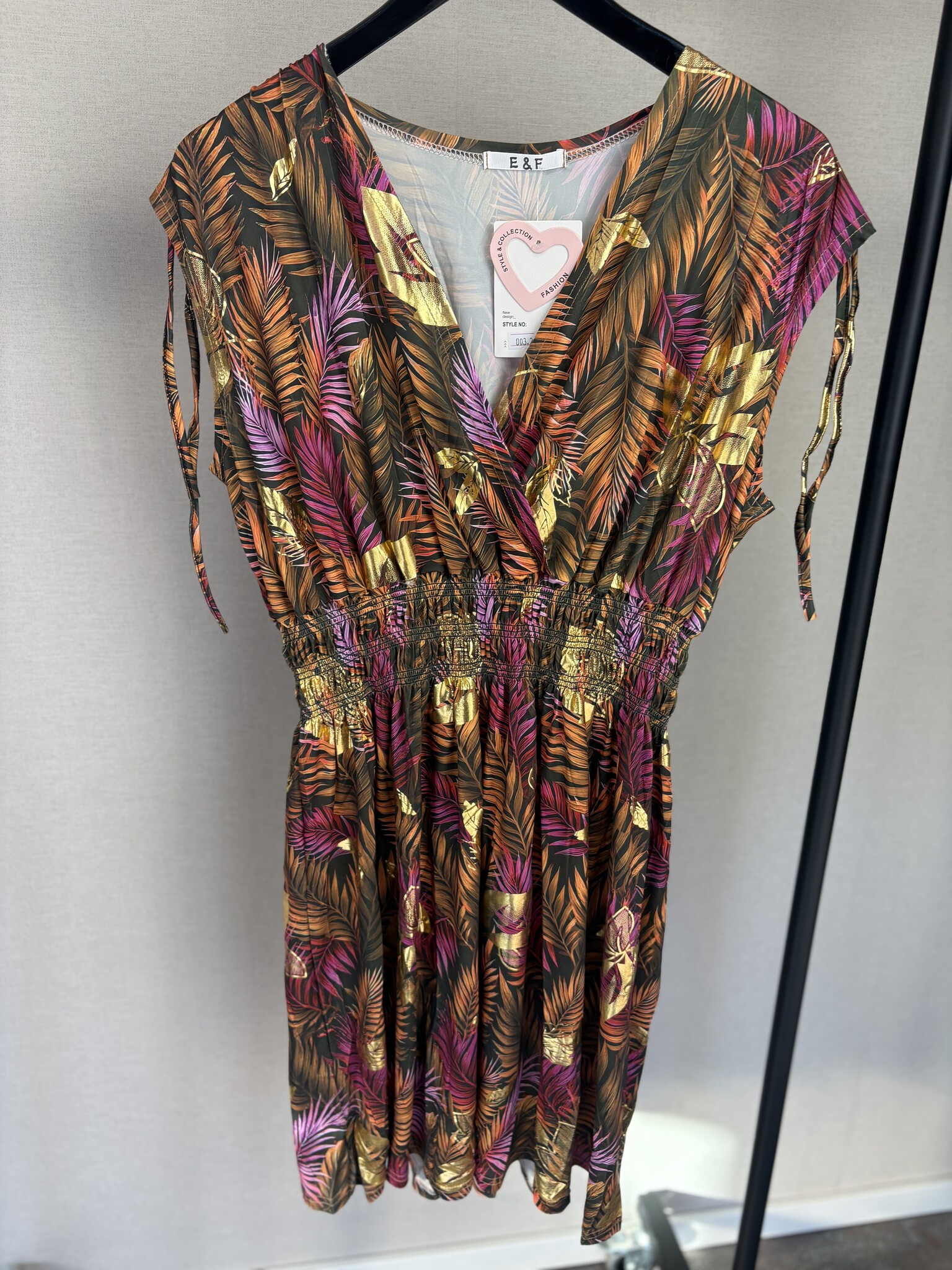 Deze jurk van Beautyvol is een fijn item voor elke zomerse dag. De jurk heeft een mooie print met een vleugje goud er door heen. De gladde stof zorgt voor een prettig draagcomfort. Voorzien van een v-hals en er zit elastiek onder de borsten. De mouwen zijn aan de bovenzijde voorzien van koortjes, waarmee je ze aan de bovenzijde elegant kan plooien.