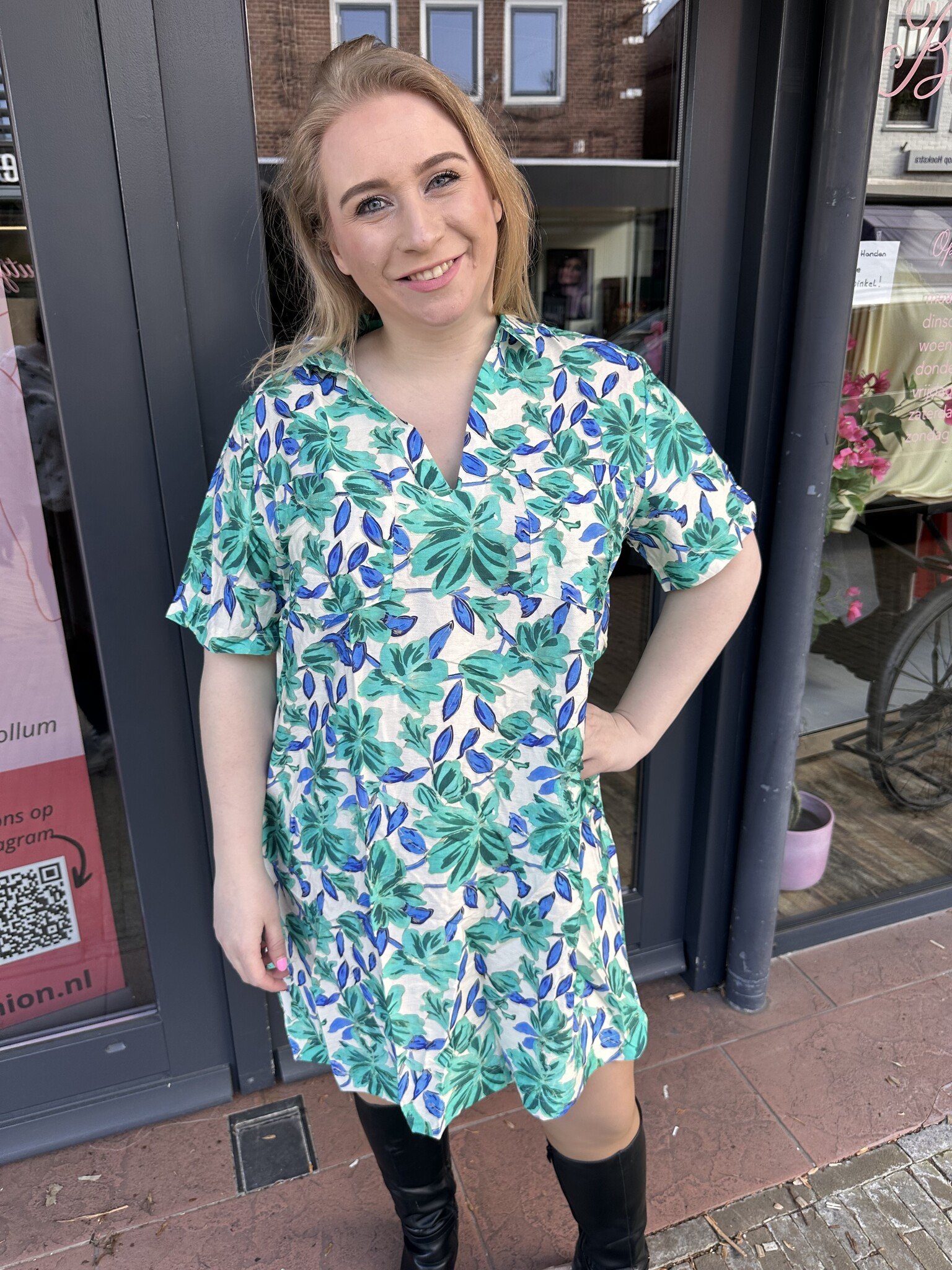 De jurk komt boven de knie en heeft een onder jurkje er onder.