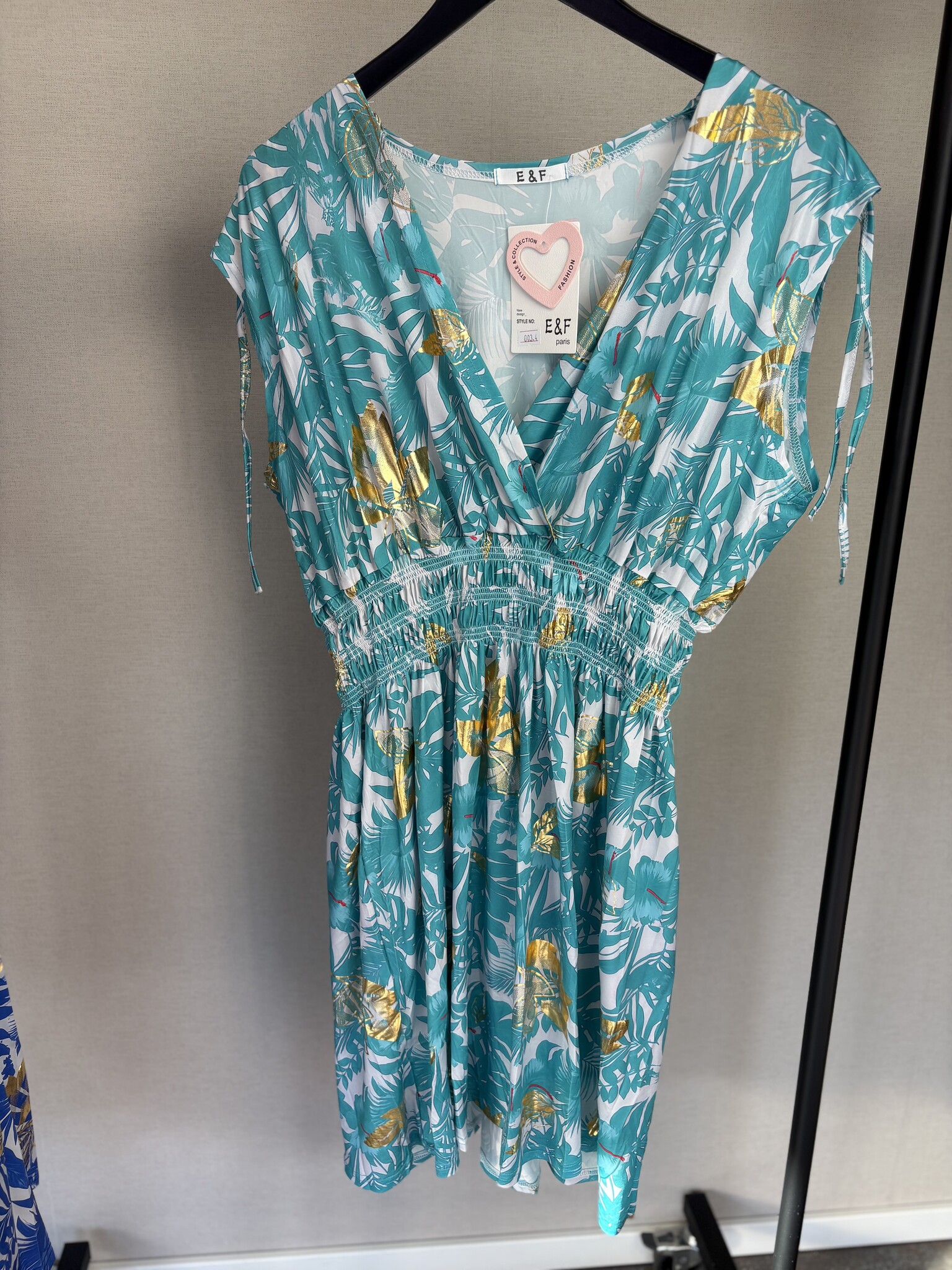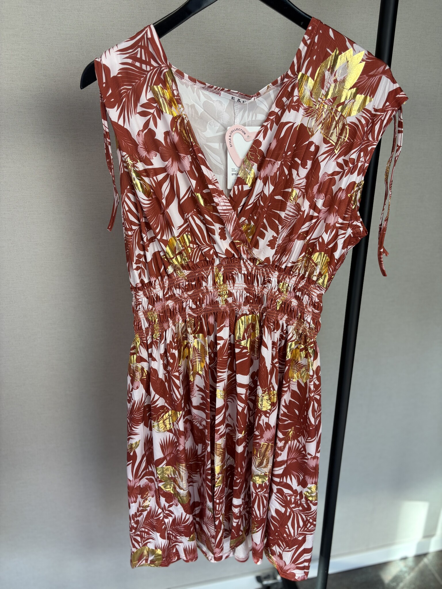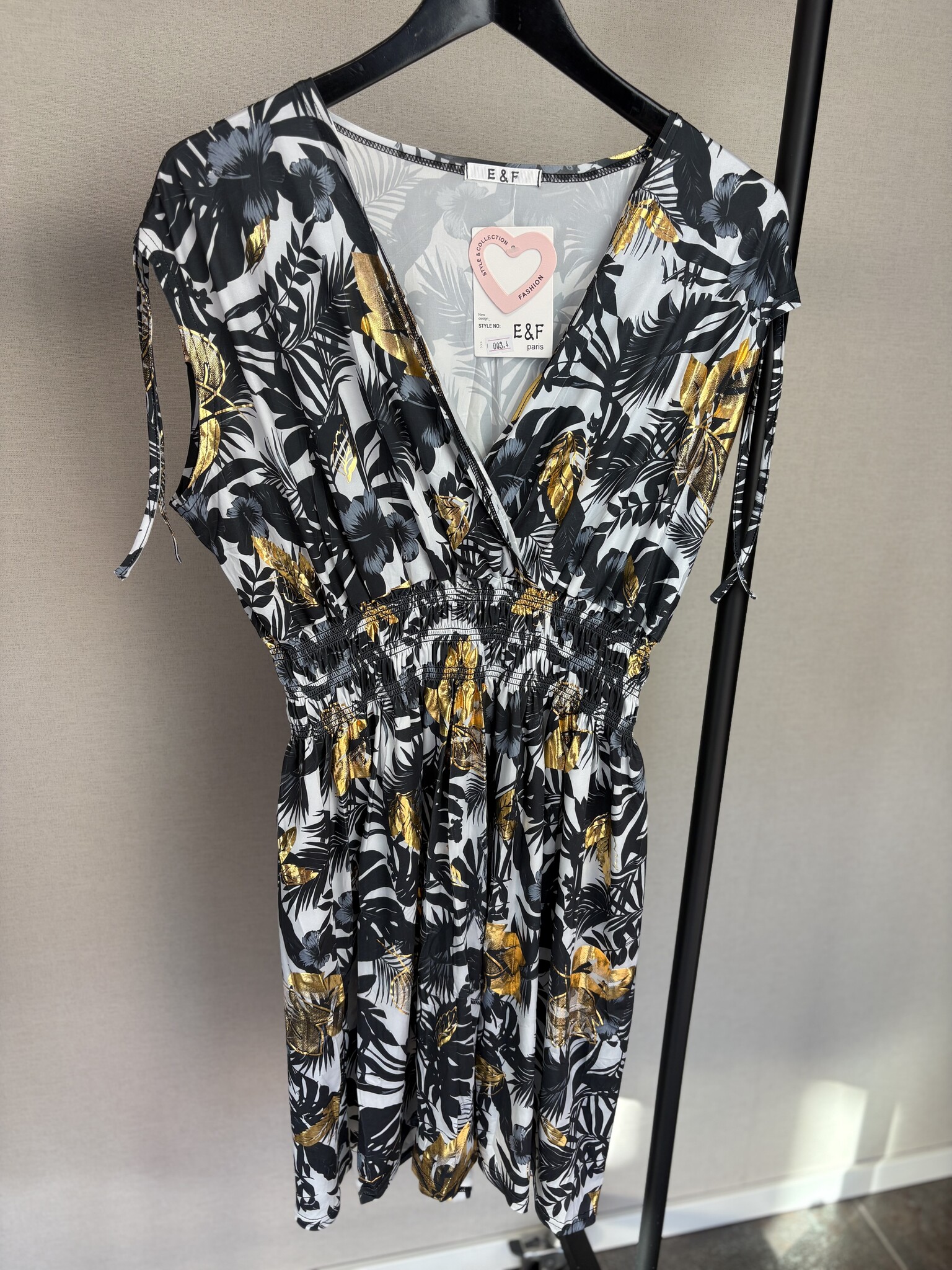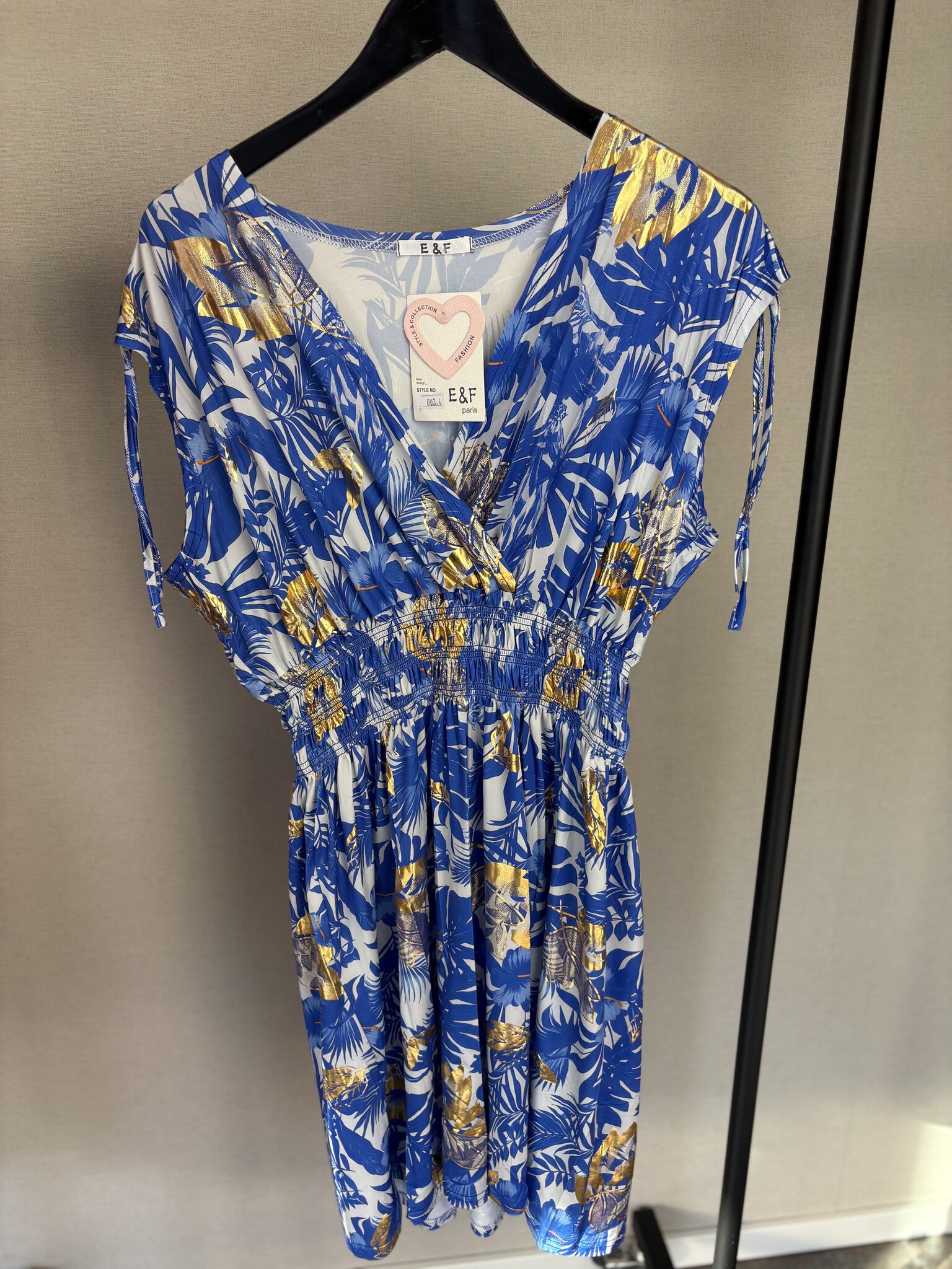 Deze jurk van Beautyvol is een fijn item voor elke zomerse dag. De jurk heeft een mooie print met een vleugje goud er door heen. De gladde stof zorgt voor een prettig draagcomfort. Voorzien van een v-hals en er zit elastiek onder de borsten. De mouwen zijn aan de bovenzijde voorzien van koortjes, waarmee je ze aan de bovenzijde elegant kan plooien.