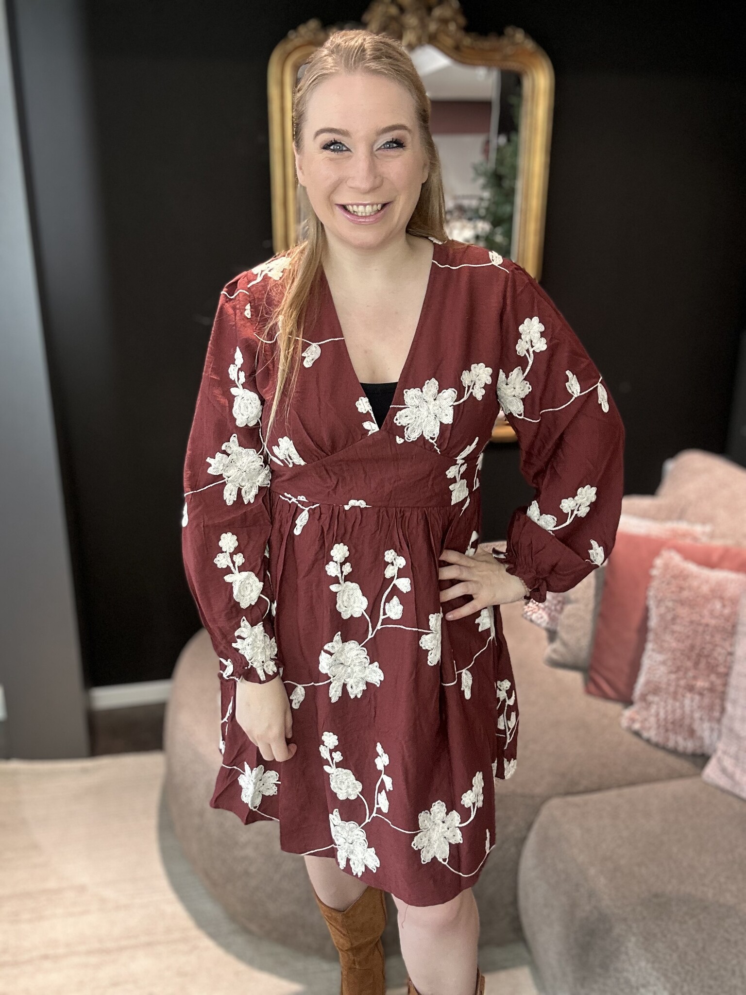 Prachtige jurk van een hele fijne stof, uitgevoerd in een donkerblauwe of een roest kleur met een bloemen borduursel. Valt goed maat.