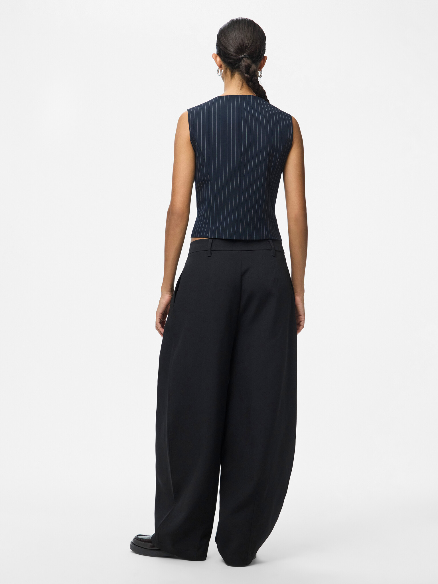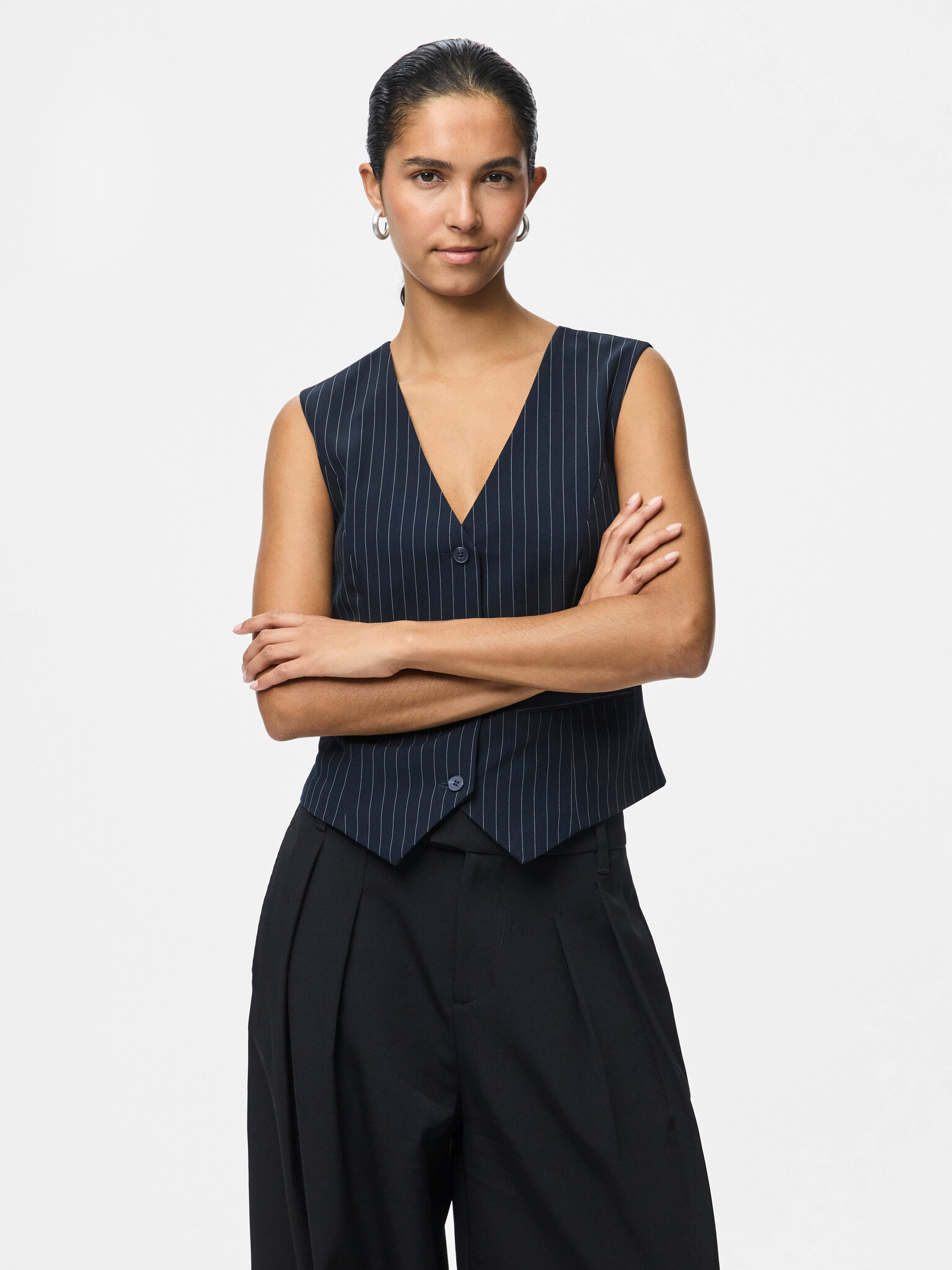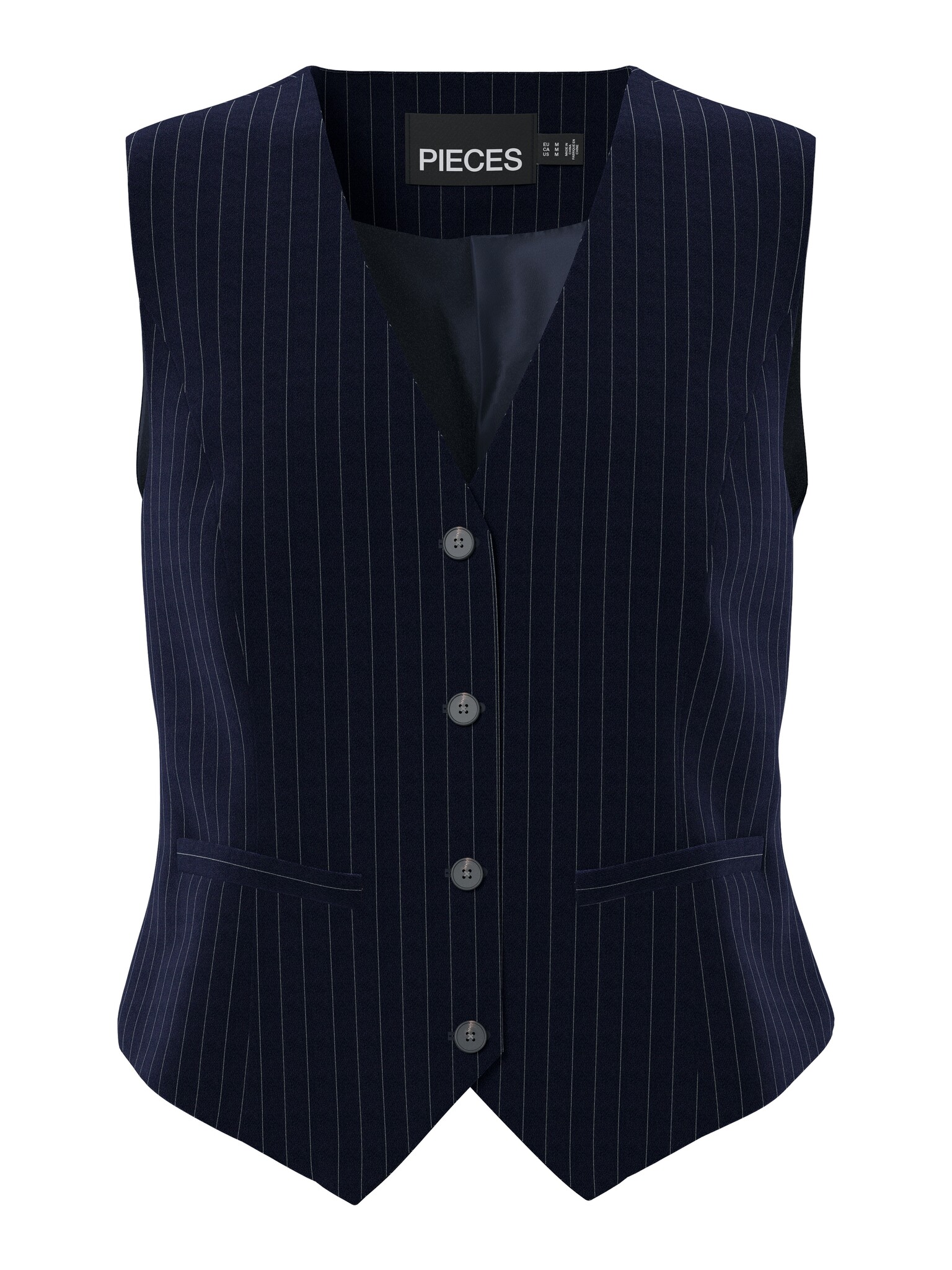 Op zoek naar een casual chic gilet? Dit gilet van Pieces heeft een mooie blauwe kleur in elegante krijtstreep. Afgewerkt met twee zakken aan de voorkant. Ideaal om te combineren met een blouse voor een chique outfit.