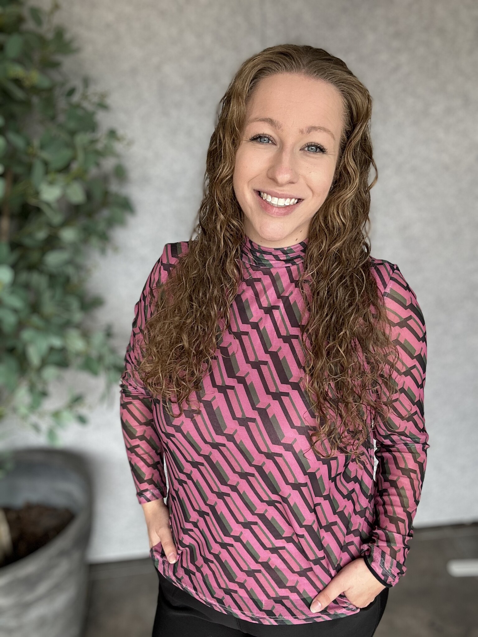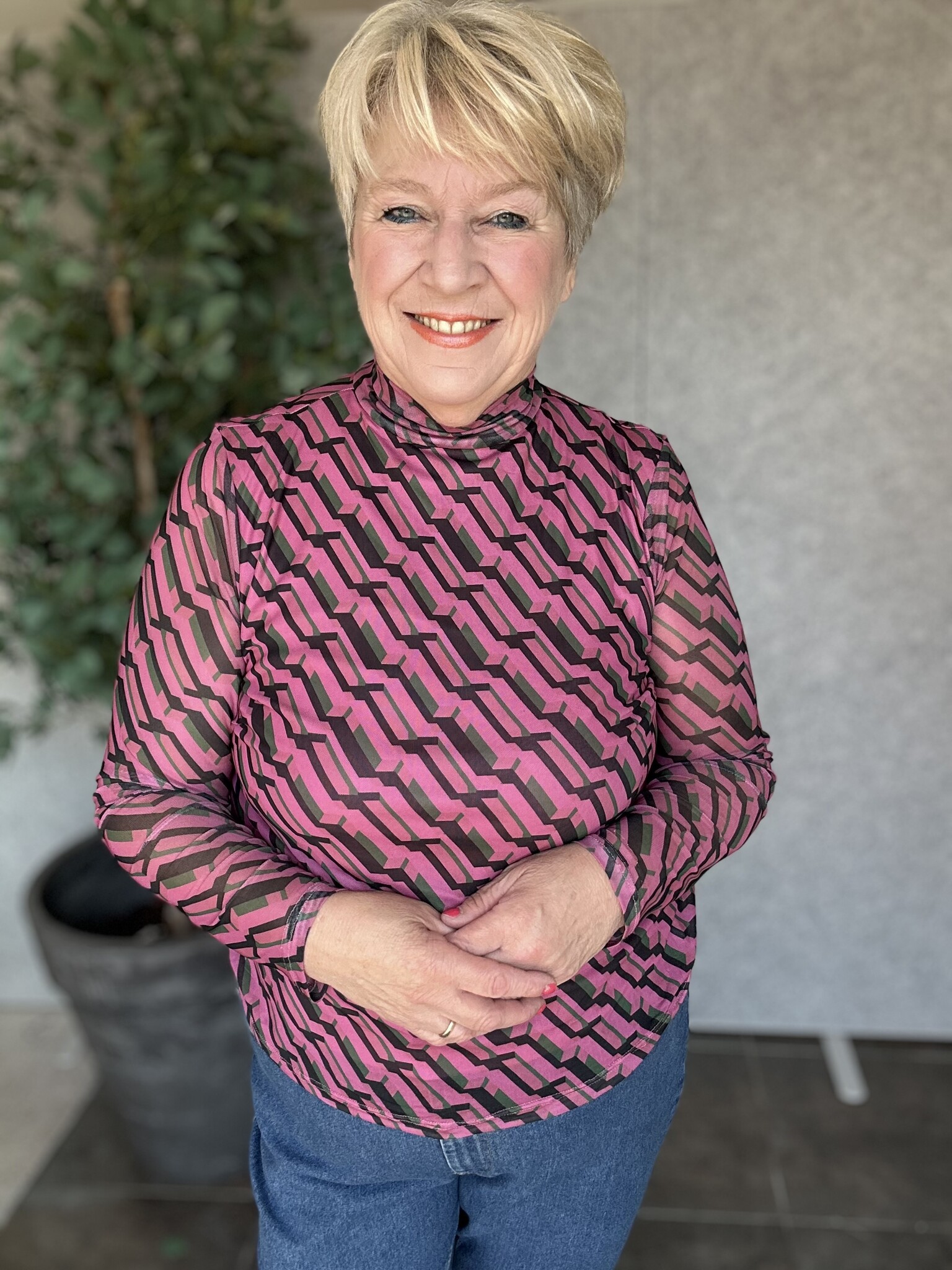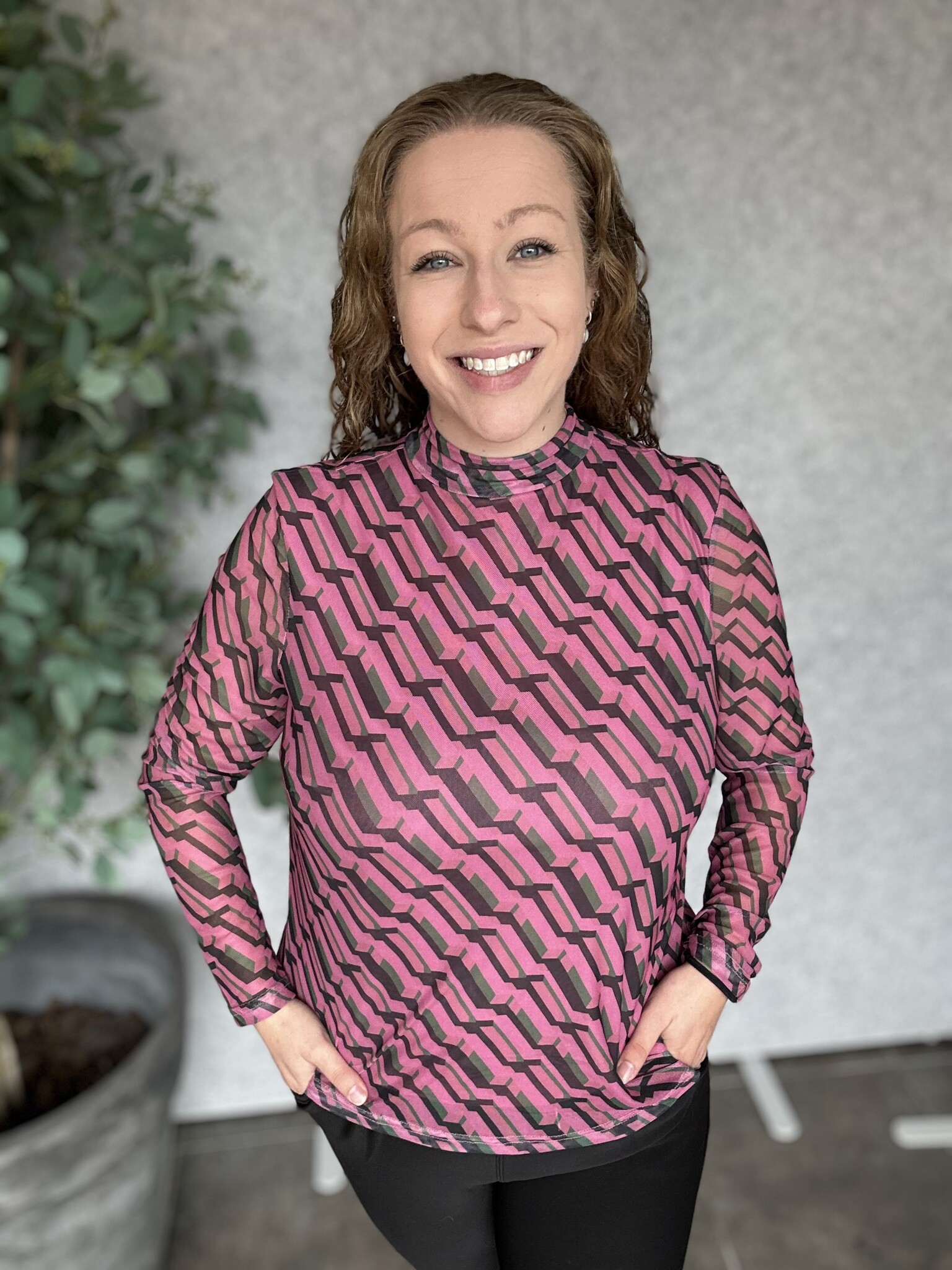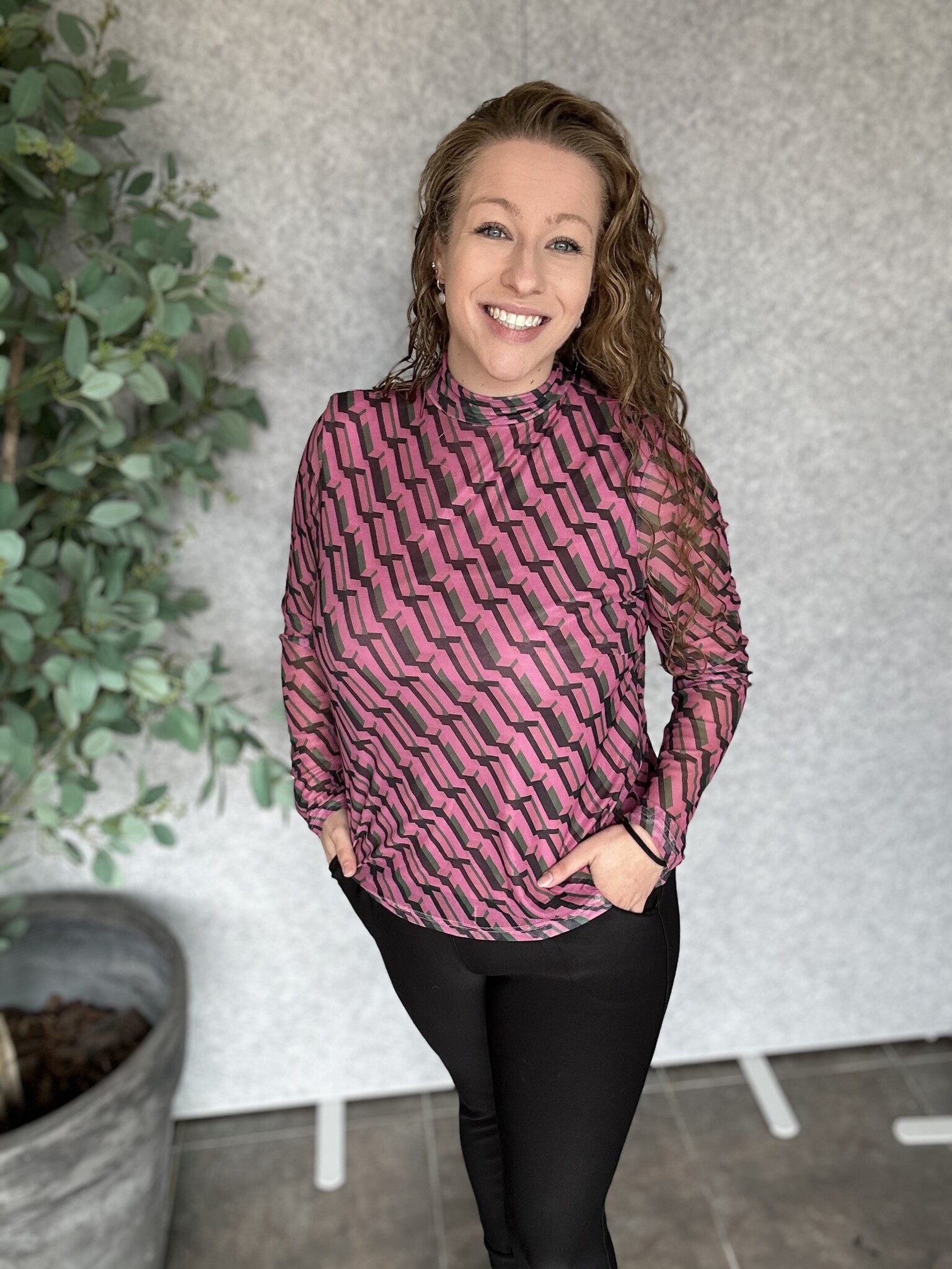 Pieces Curve - Wat een geweldige blouse van het merk Pieces Curve met een speelse geometische print in de kleuren roze, groen en zwart. Mesh met een ondershirt in het roze. Zit mega lekker & valt goed op maat.