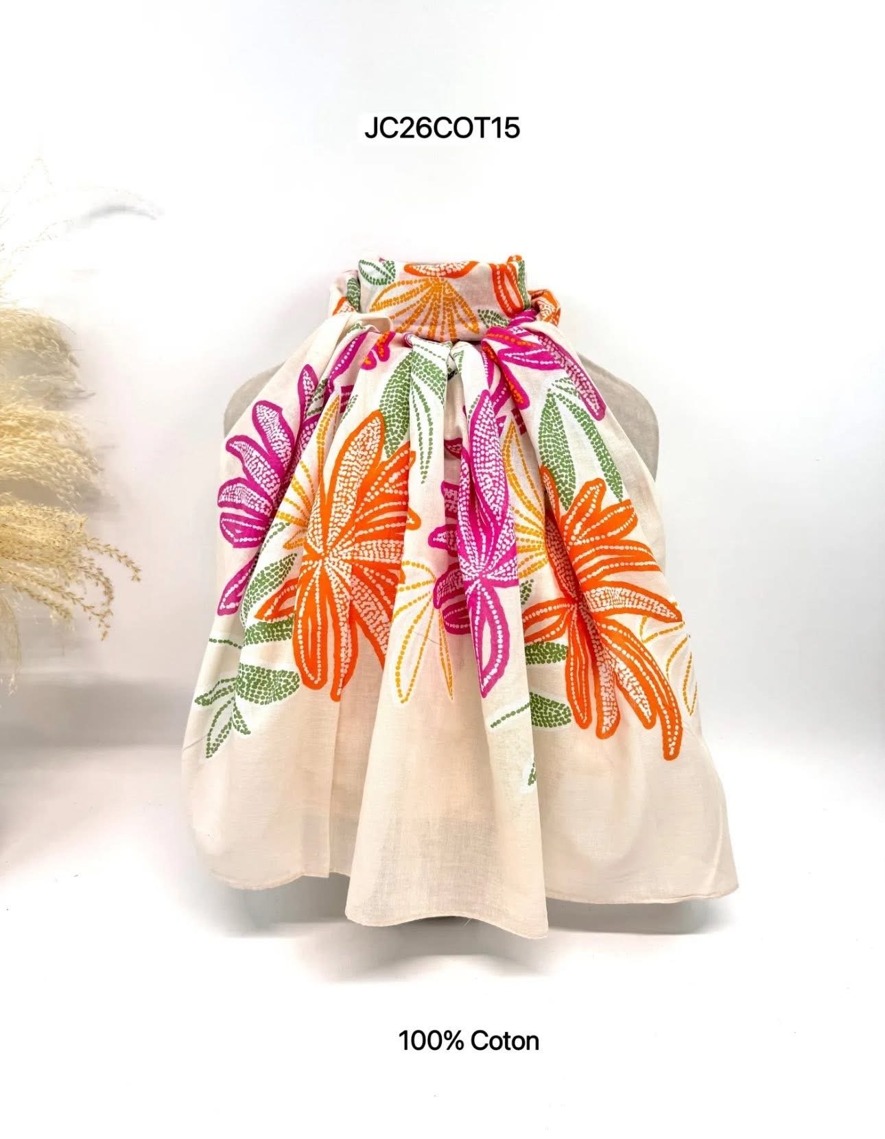 Het exotische design van sjaal Palma maakt je toch meteen vrolijk? Sjaal Palma is door de combinatie van roze, groen en oranje een perfect kledingstuk om mee te combineren in het voorjaar. Palma is leuk te combineren met een blouse om casual en elegant voor de dag te komen. Doordat de sjaal van katoen is gemaakt voelt deze koel aan, zonder op het zachte gevoel in te leveren.
