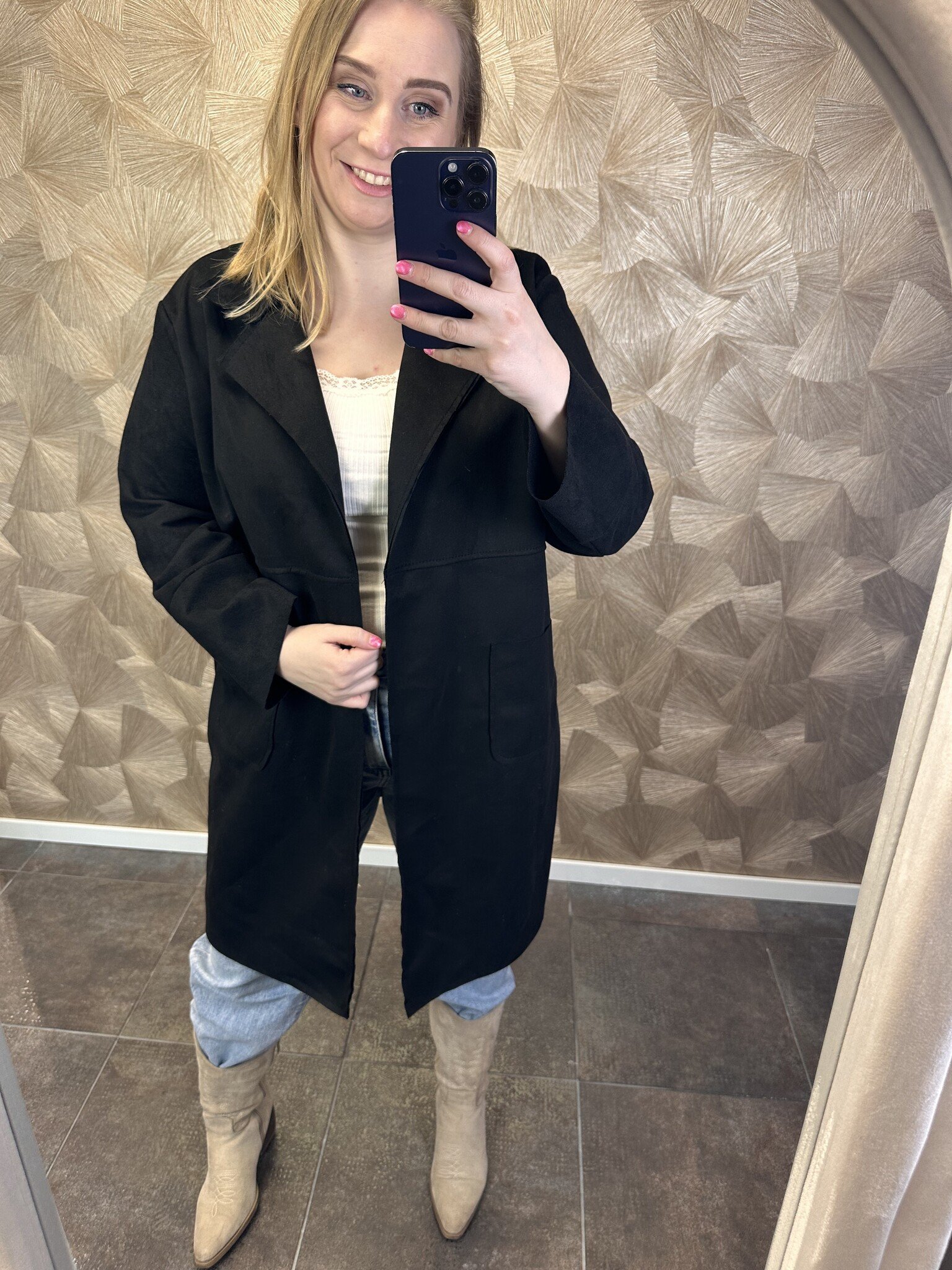 Maak je outfit compleet met dit stijlvolle suedine jasje in zwart, taupe, roze en beige. Dankzij het zachte materiaal en de mooie kleurencombinatie is het een veelzijdige eyecatcher voor elke gelegenheid.