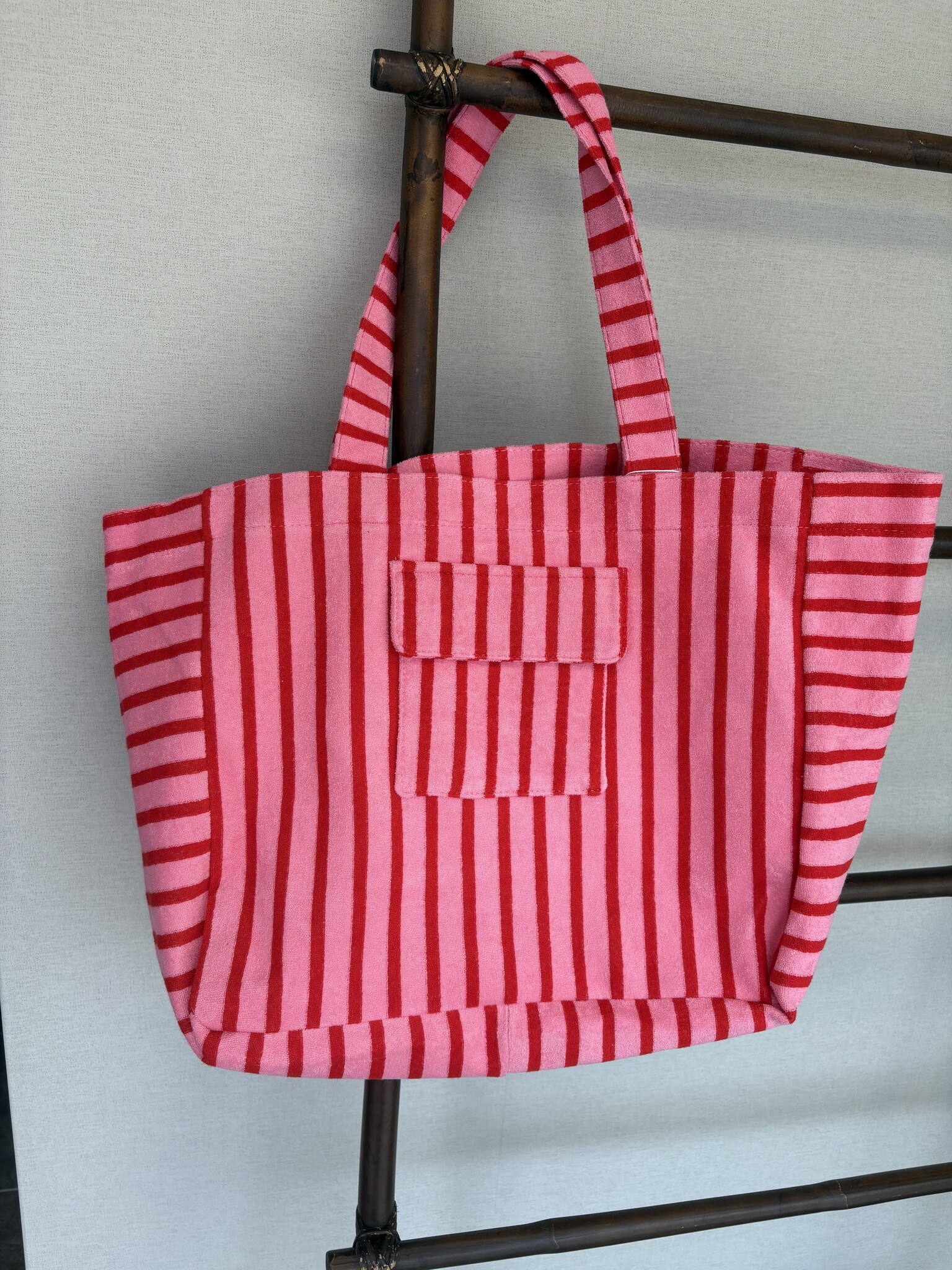 Deze zachte shopper met speelse strepen is jouw nieuwe go-to tas. Ruim, comfy en perfect voor elke dag – van boodschappen tot een dagje uit.