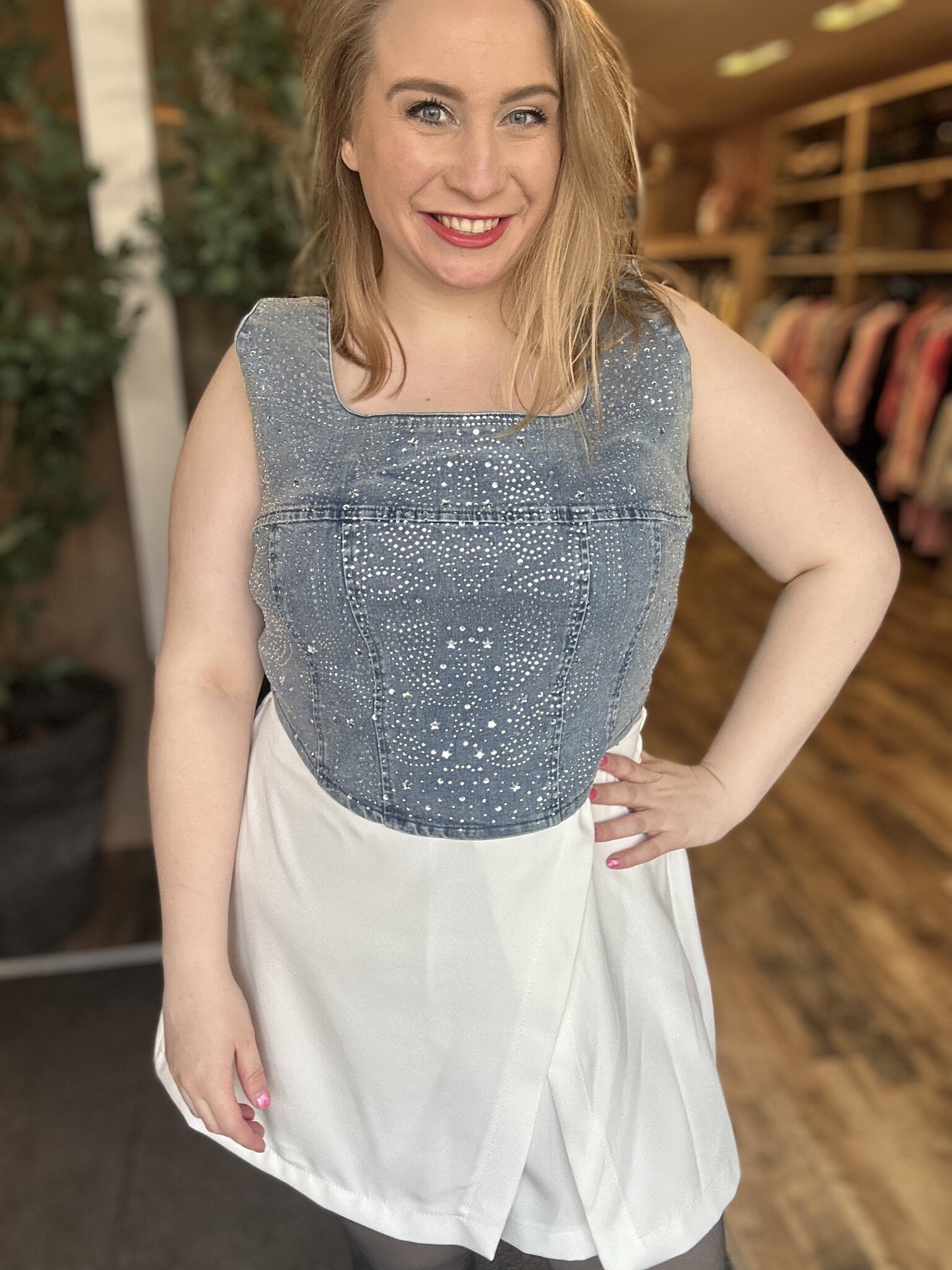 Wat is dit een unieke top in jeansstof bedekt met steentjes. Perfect voor het festivalseizoen! Met deze top kun je eindeloos combineren. Aan de achterkant van deze top zit een strook van elastiek, waardoor deze top mooi vormt aan je lichaam.