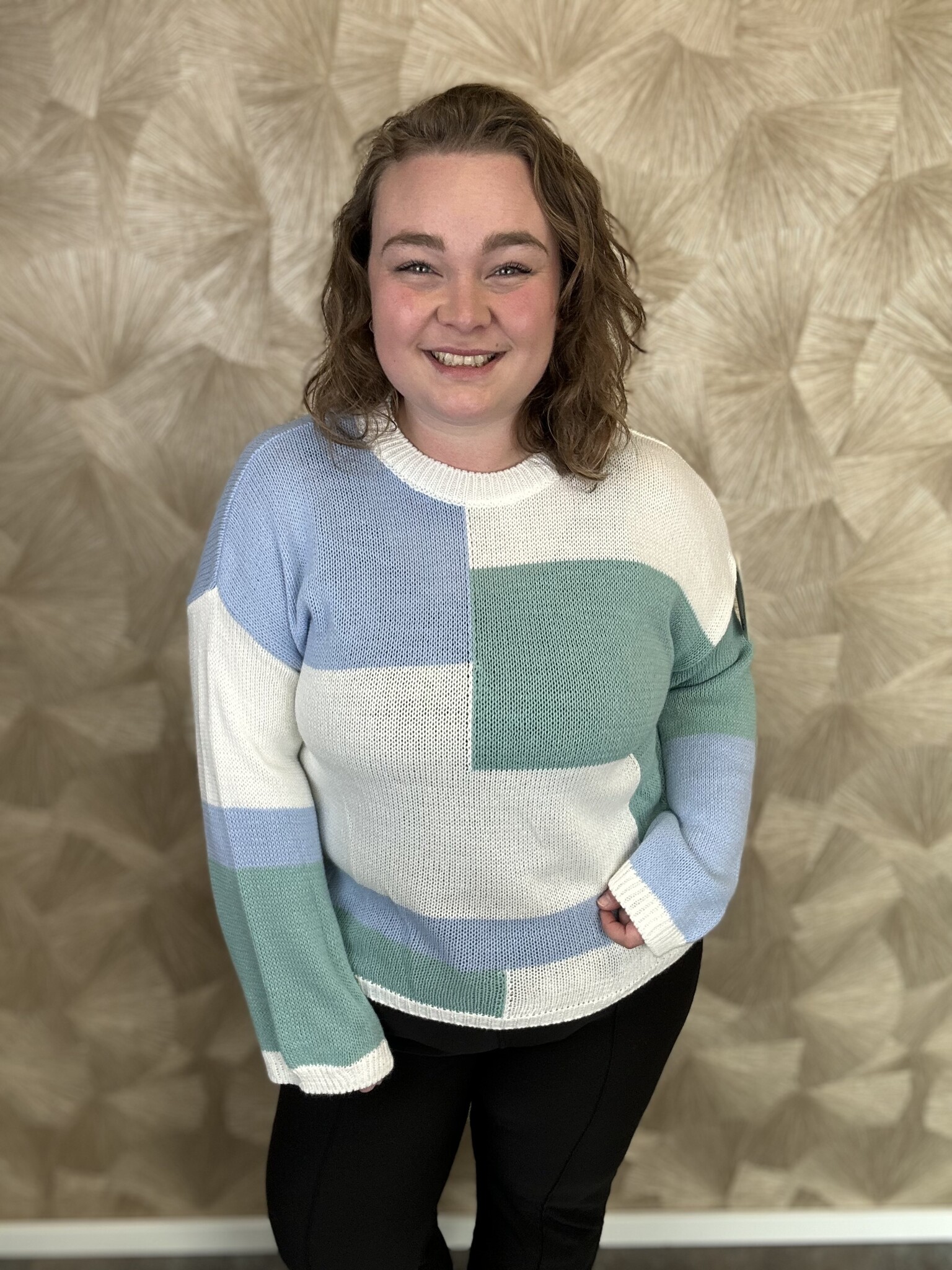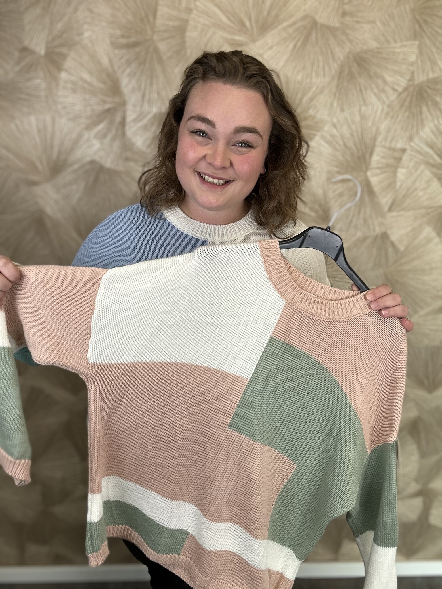 Beautyvol - Deze 'gebreide trui' valt op door de speelse kleurenblokken die samen een vrolijk en stijlvol patroon vormen. De ronde hals en het zachte, licht textuurrijke breisel maken de trui zowel draagbaar als trendy. Perfect om te combineren met jeans, rok of casual broek voor een gezellige, modieuze look.