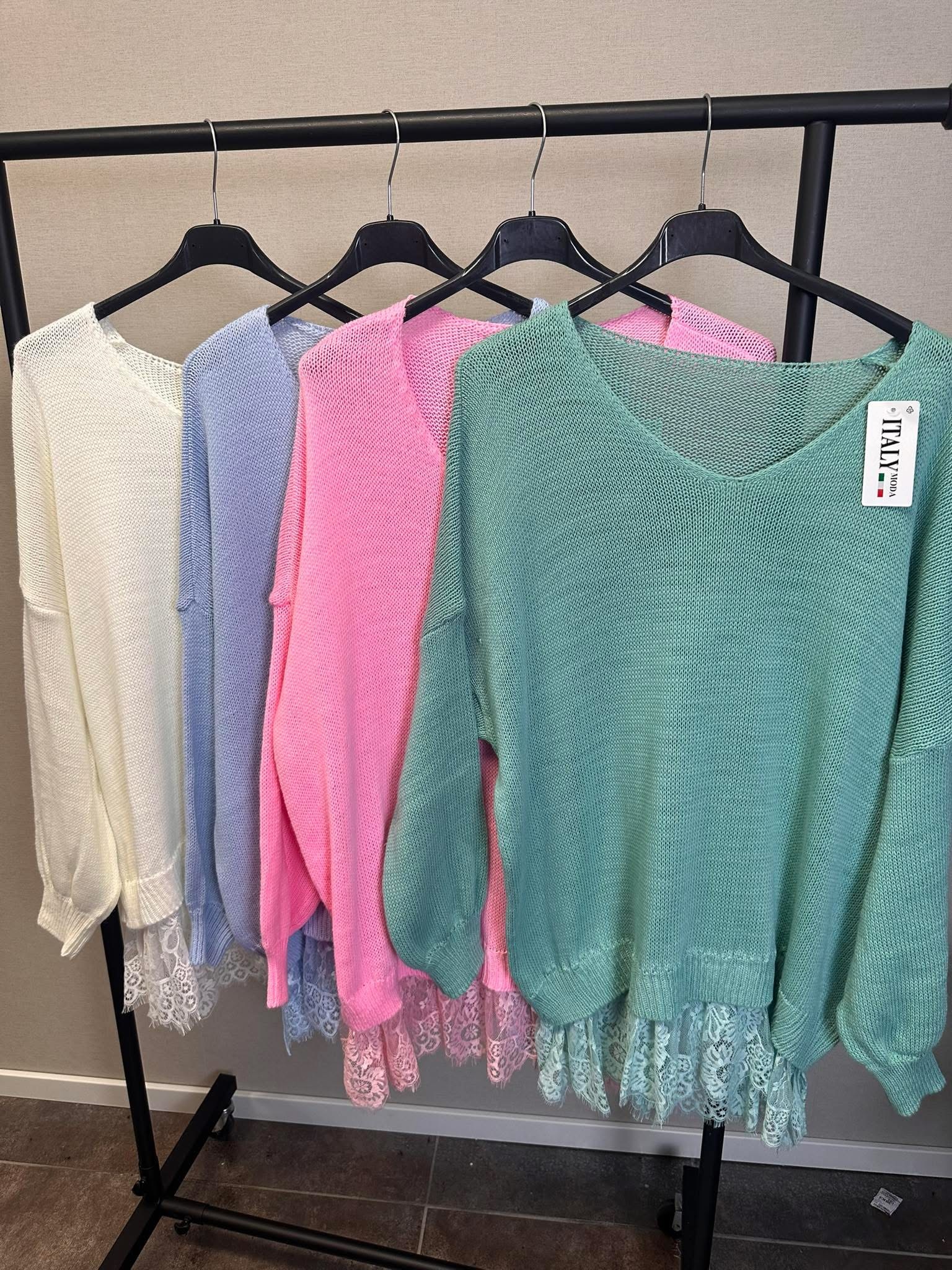 Super leuke truien met kanten onderkant, te dragen met maat 44 t/m 54.