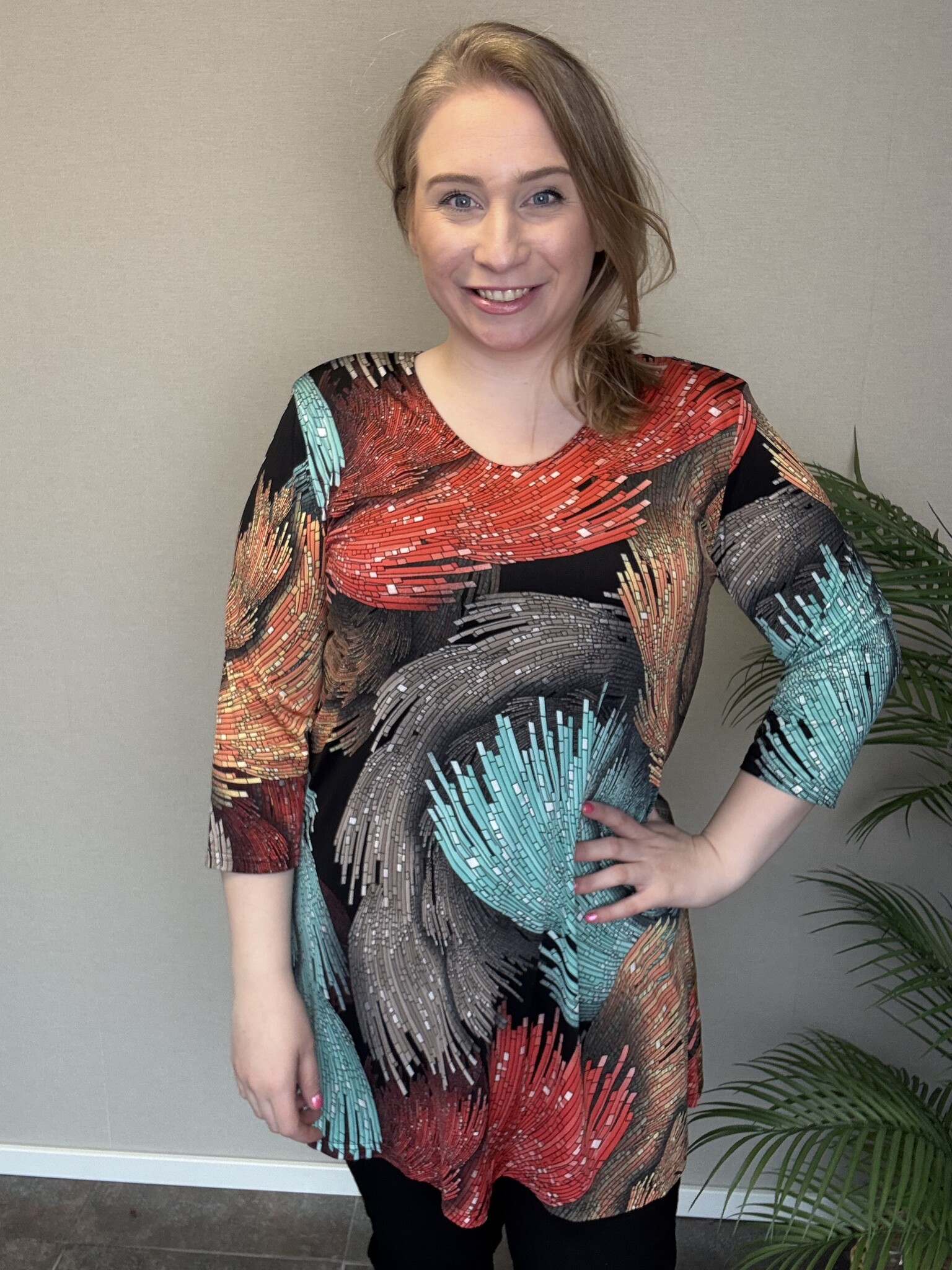 De B-6004 van Magna Fashion is een lang model met ¾-mouwen en een mooie V-hals. Tuniek Britt heeft in de basis een zwarte kleur met een opvallende print in het blauw, rood, grijs en oranje. Dit tuniek is makkelijk te combineren met een zwarte legging tot een chique outfit.