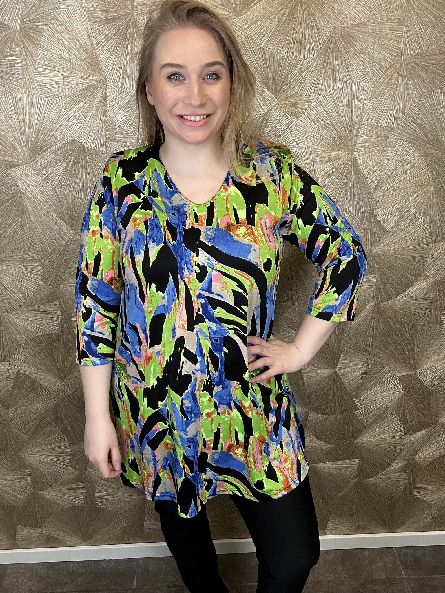 Leuk om als set te dragen met de lange gilet van Magna Fashion, met bijvoorbeeld de kleur kobalt die ook weer mooi terug komt in de tuniek.