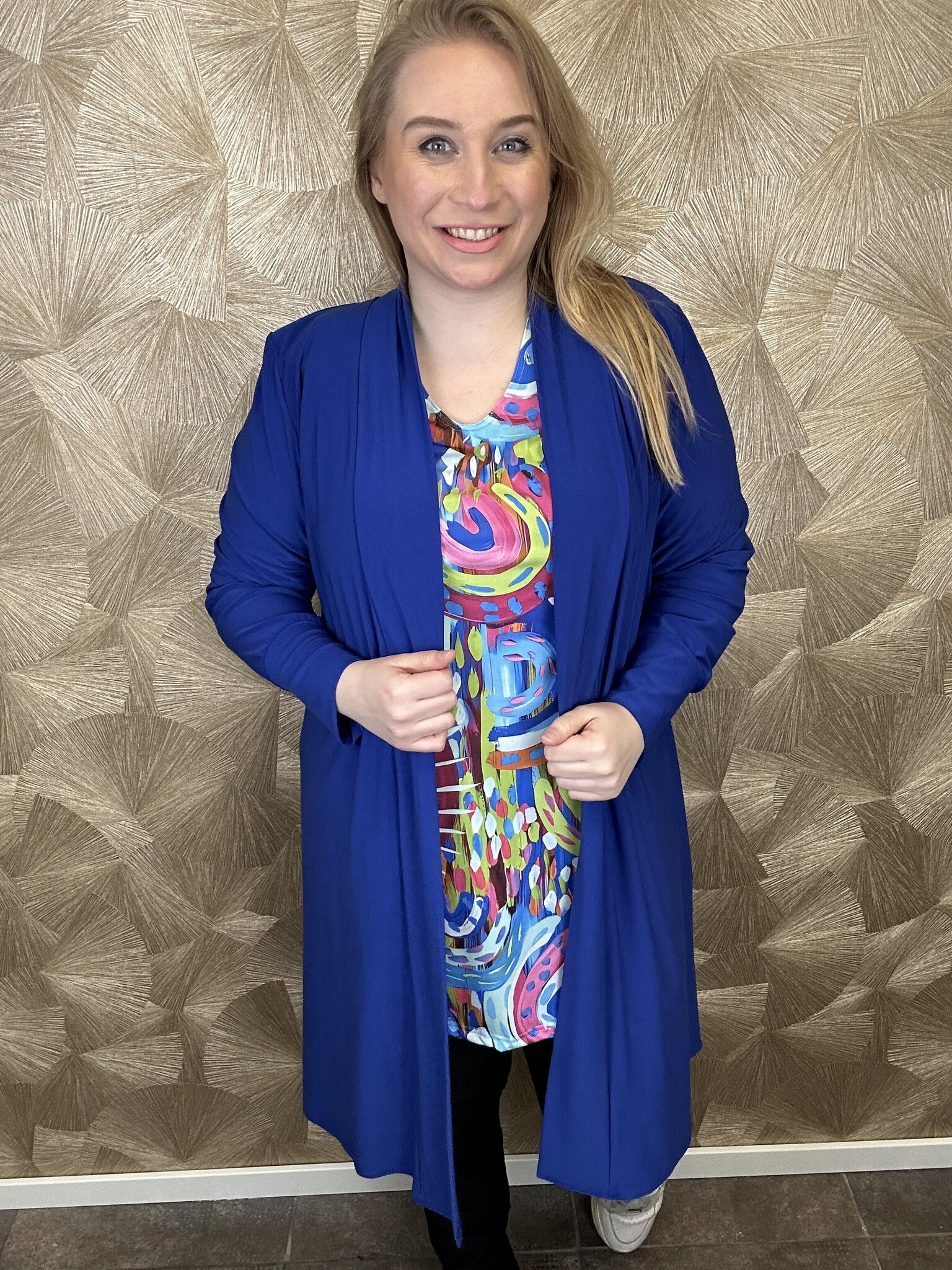 Leuk om als set te dragen met de lange vesten Magna Fashion, met bijvoorbeeld de kleur kobalt die ook weer mooi terug komt in de tuniek.