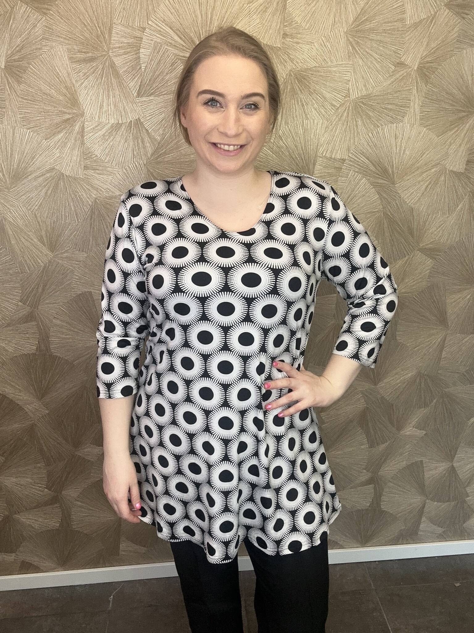 Tuniek Shinny heeft een elegant patroon in het zwart en wit. Deze B-6004 tuniek van Magna Fashion heeft een comfortabele pasvorm door de ¾-mouwen die makkelijk op te knopen zijn. Een mooi tuniek dat mooi in combinatie met een zwarte broek staat.