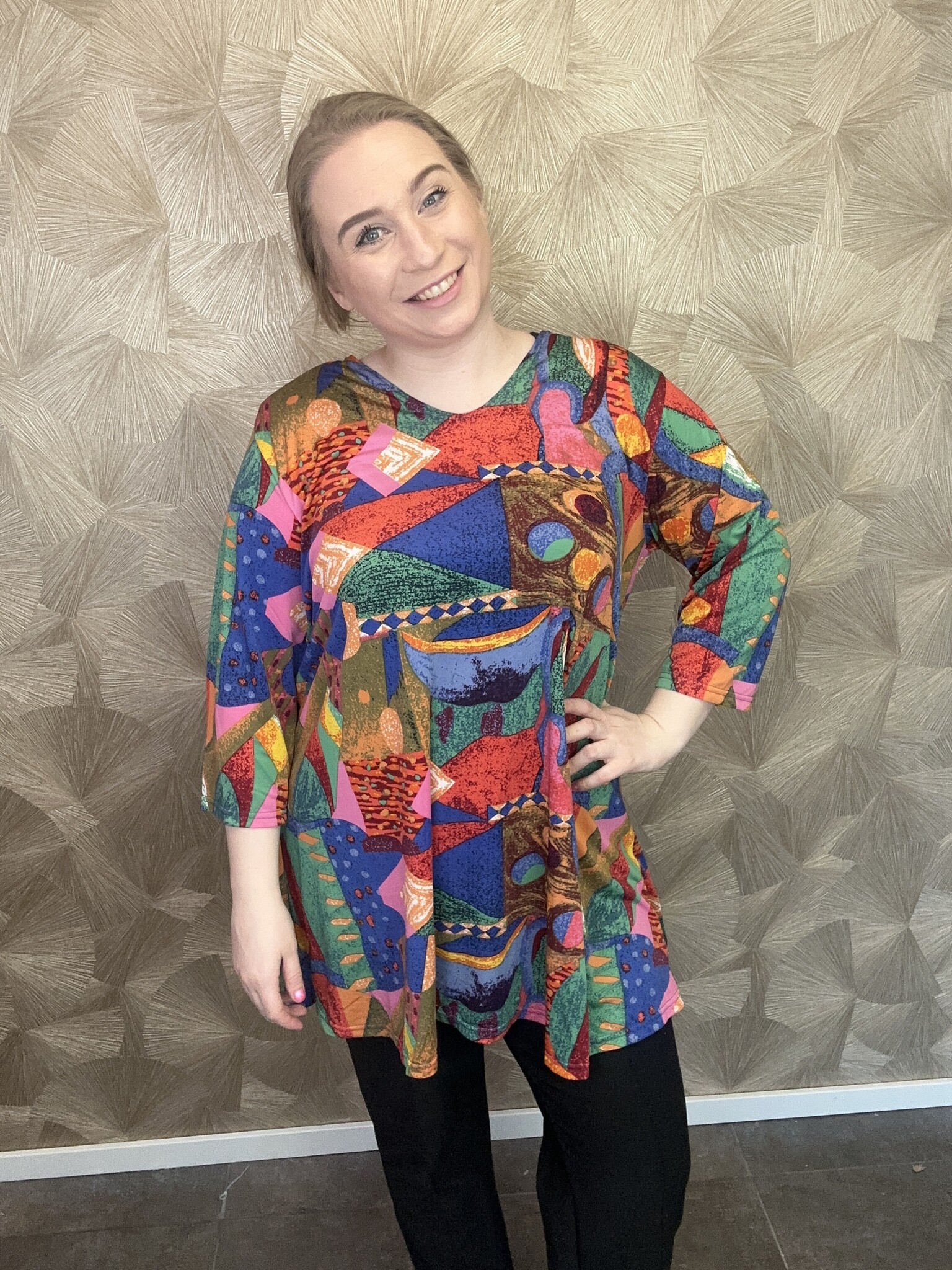 Deze tuniek van Magna Fashion is een lang model met ¾-mouwen. Door de mooie V-hals is dit altijd een zeer populair model, doordat deze makkelijk te combineren is. De tuniek heeft een print met levendige kleuren, perfect om elegant voor de dag te komen.