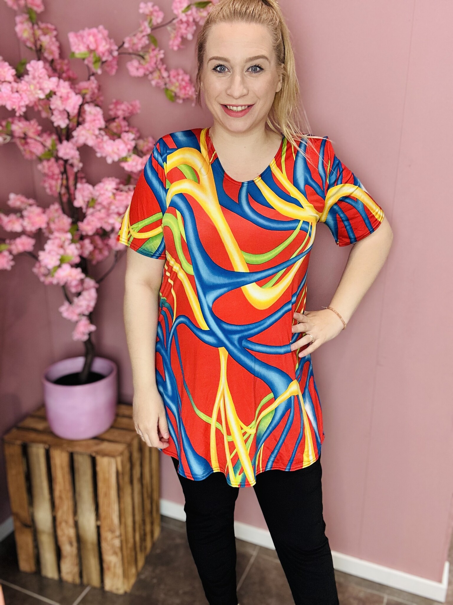Magna Fashion; Deze mooie tuniek van Magna Fashion heeft een ronde hals, korte mouwen en een vrolijke print. Een heerlijk draagbaar model dat losjes valt en perfect is voor elke dag!