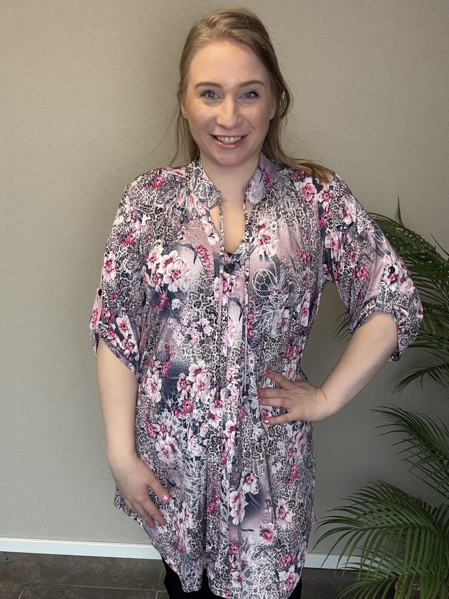 Tuniek Bloesem is uitgevoerd in het klassieke model C-2121 van Magna Fashion. Tuniek bloesem heeft halflange mouwen die je kunt opstropen tot de elleboog met een knoopje. Rond de hals zitten koordjes met hieraan nestels. Door de mooie bloemenprint met roze accenten is dit een elegant model: ideaal voor in het voorjaar of om met een mooie blazer te combineren op de koudere dagen. Door de stretchstof is dit tuniek erg comfortabel.