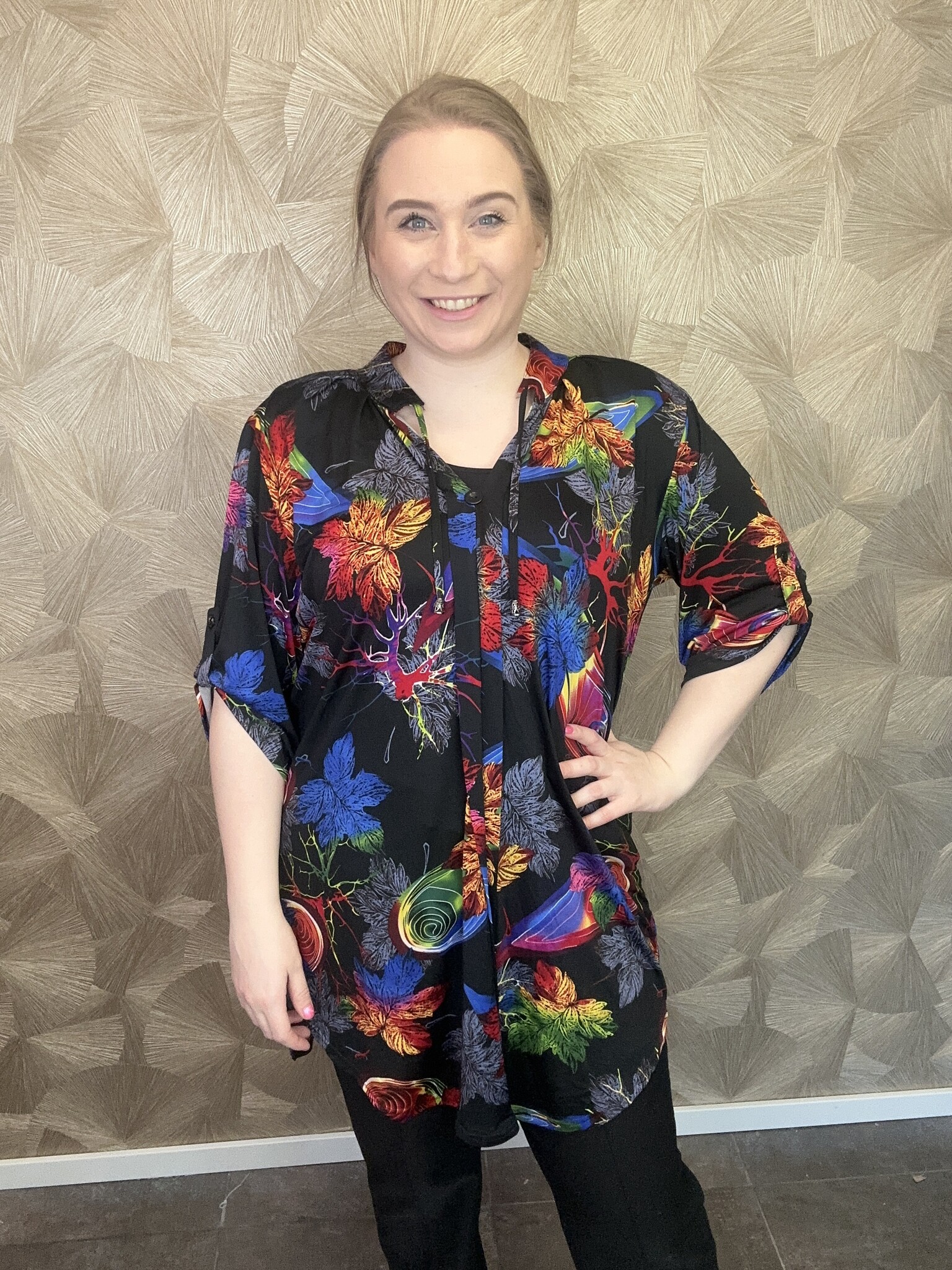 De C-2121 tuniek Dineke van Magna Fashion heeft half lange mouwen die je kan ophalen tot de elleboog. Rond de hals zitten koordjes met hieraan nestels. Ideaalom te dragen in het voorjaar of met een mooie blazer op de koudere dagen.