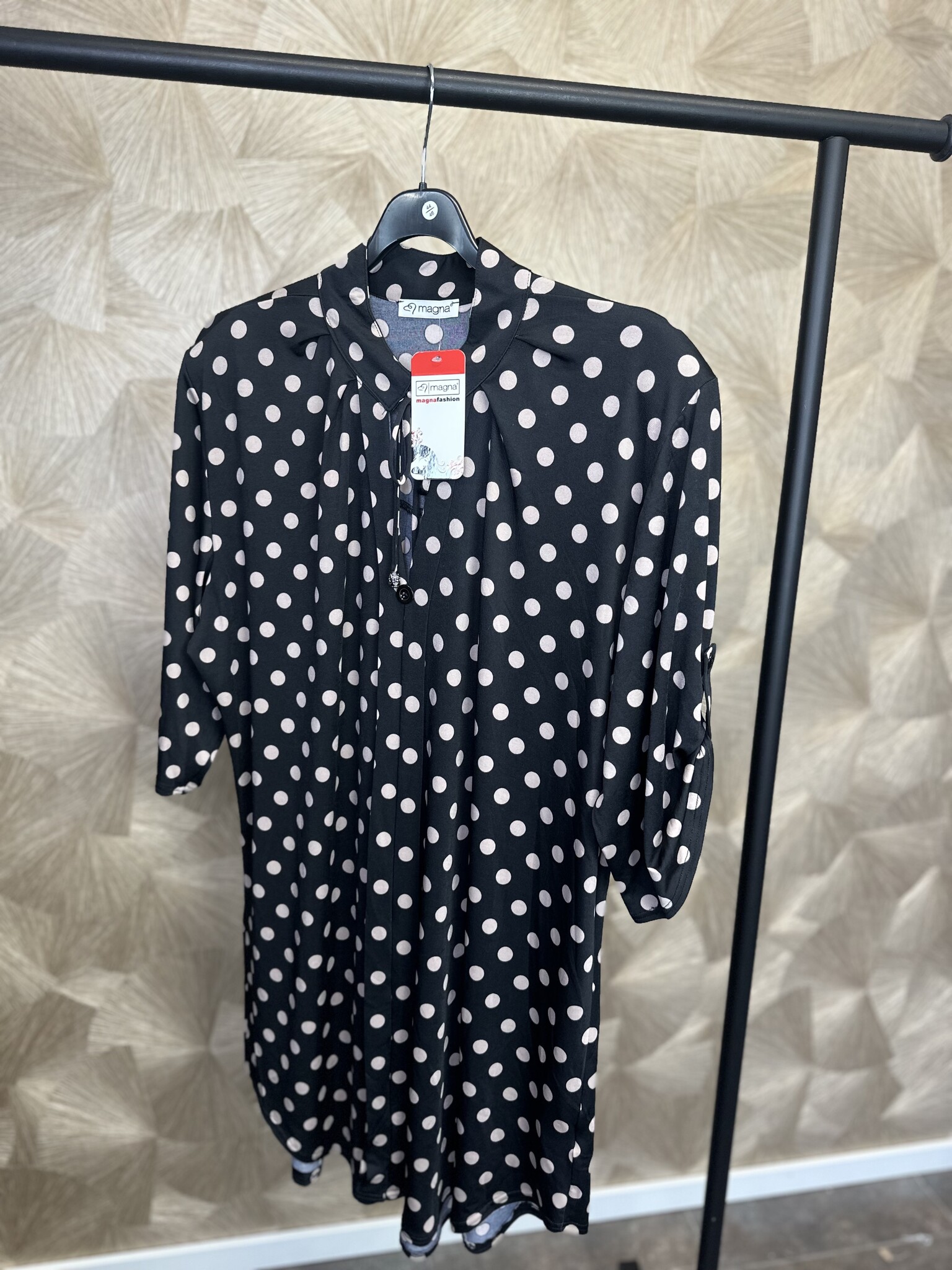 Tuniek Dotje in dit C-2121 model van Magna Fashion is een comfortabel model met half lange mouwen die je kunt ophalen tot de elleboog. De koordjes rond de hals hebben aan het uiteinde nestels die je tot een strik kan opknopen, maar ook mooi los kan dragen.